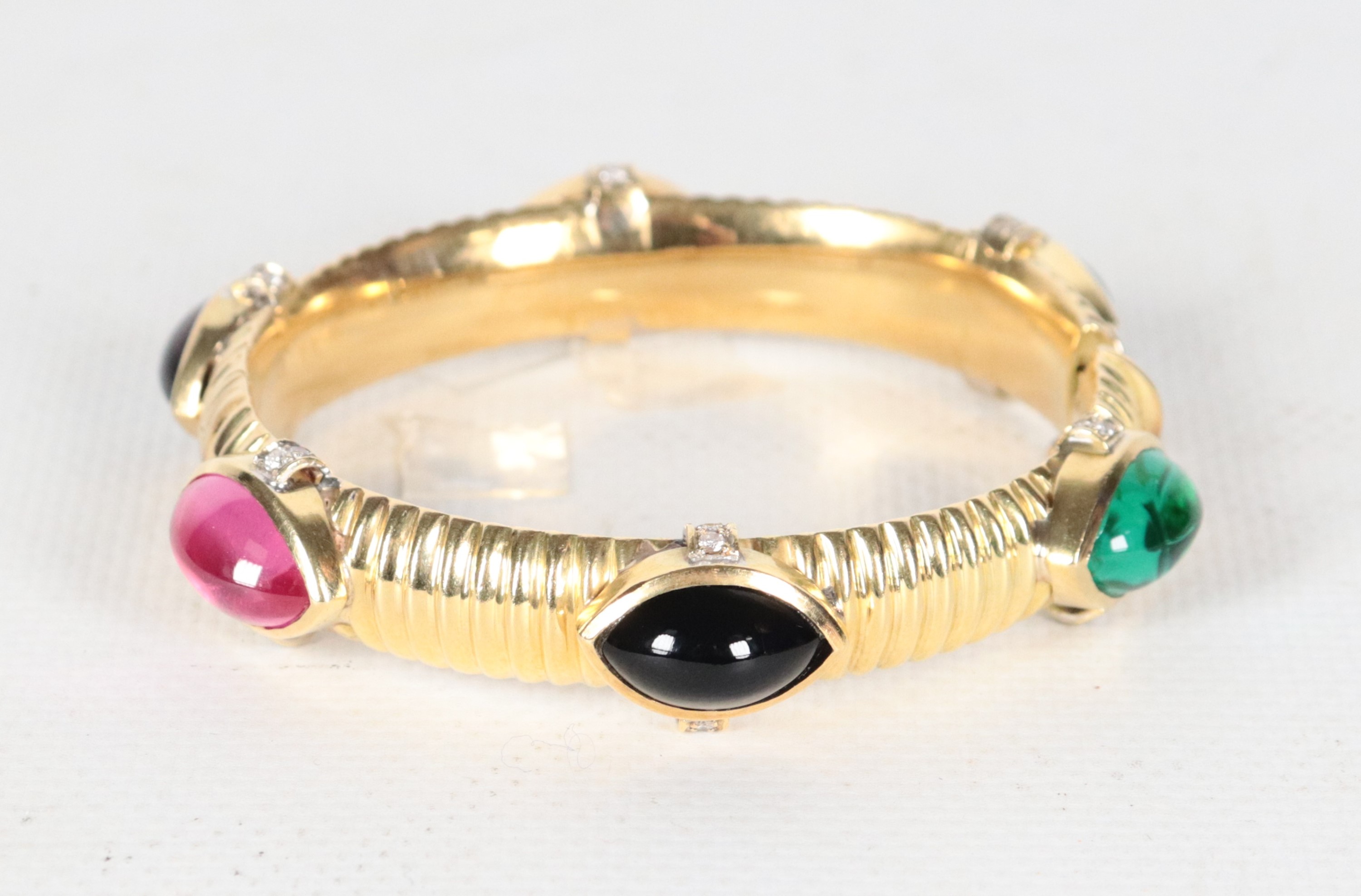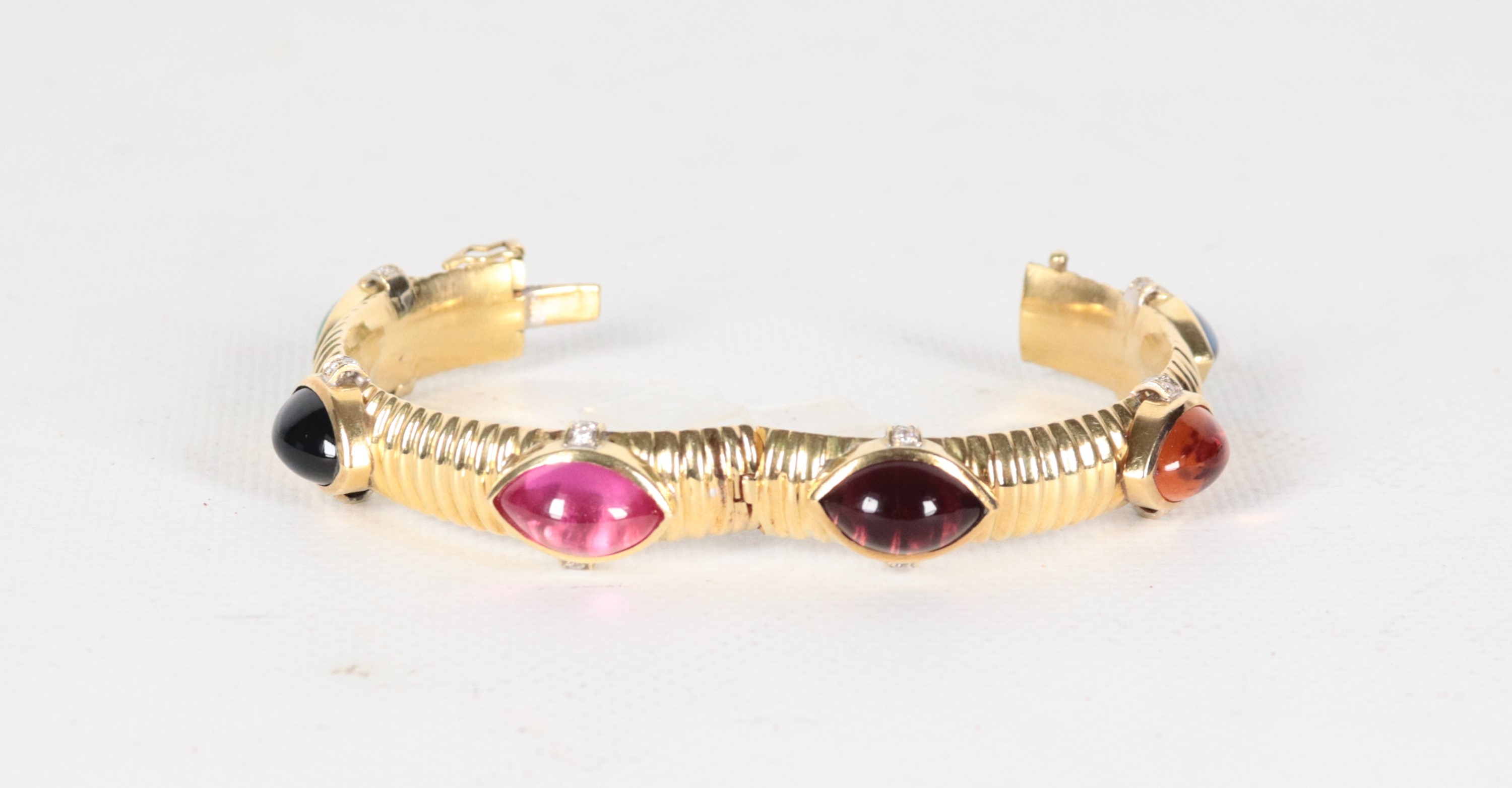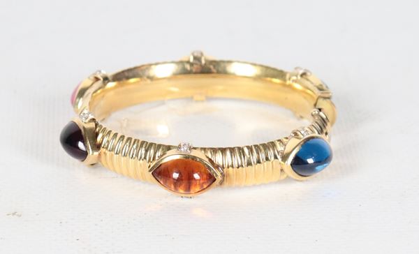 Bracciale rigido in oro giallo 18kt con pietre colorate e piccoli diamanti ct 0,45 circa. Peso lordo gr. 50,5