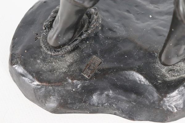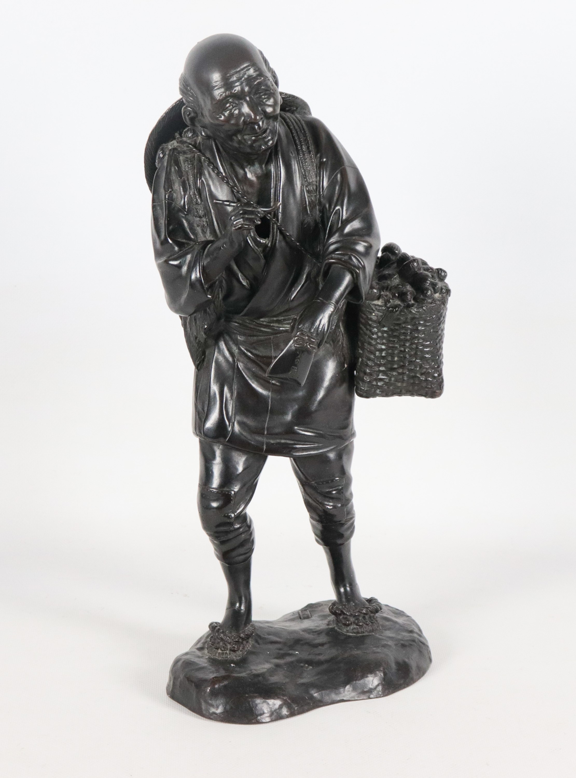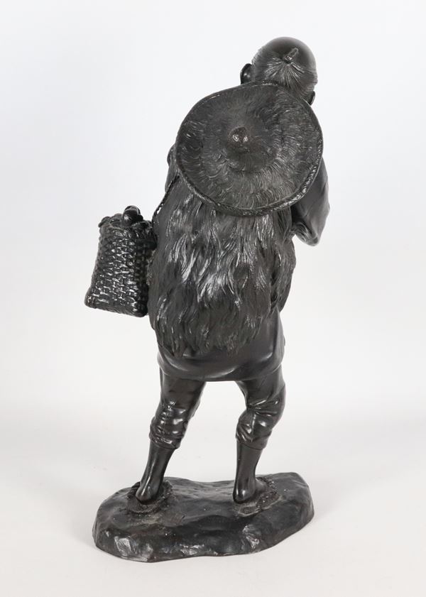 "Contadino con cesto di frutta", antica scultura in bronzo
