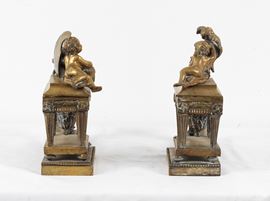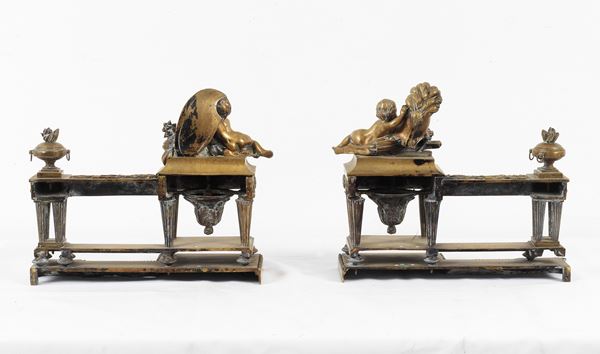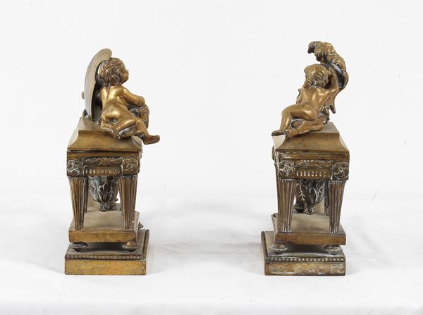 Coppia di antichi alari francesi in bronzo dorato con sculture di putti