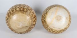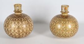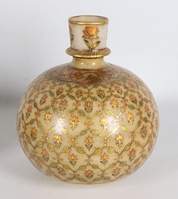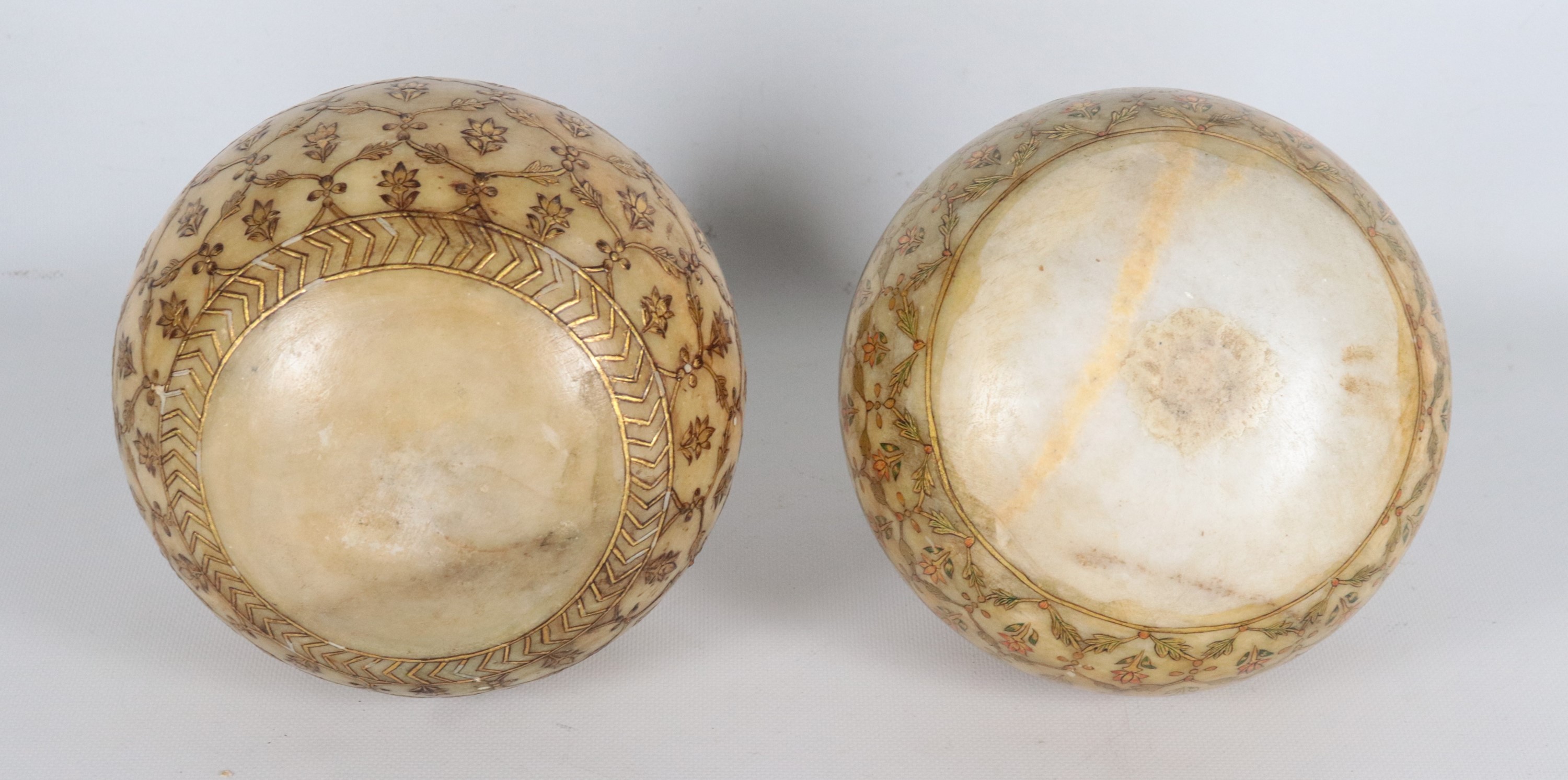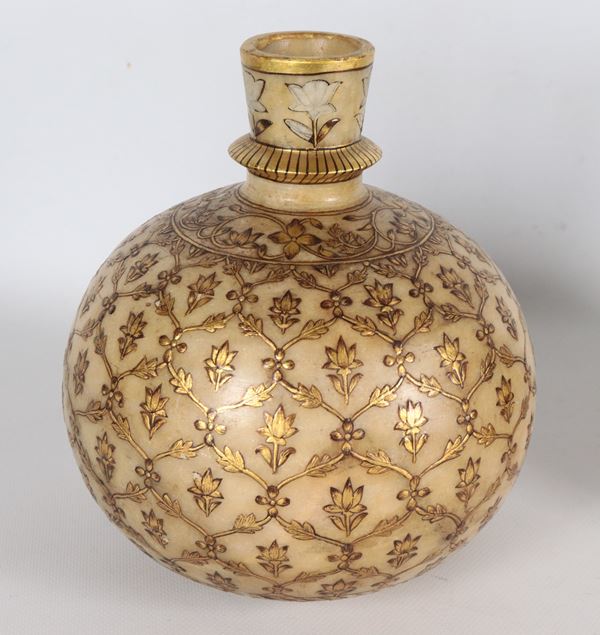 Coppia di antichi vasi a boccia in marmo di alabastro, interamente decorati a rilievo a motivi di intrecci floreali dorati
