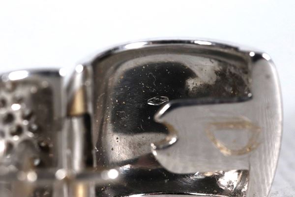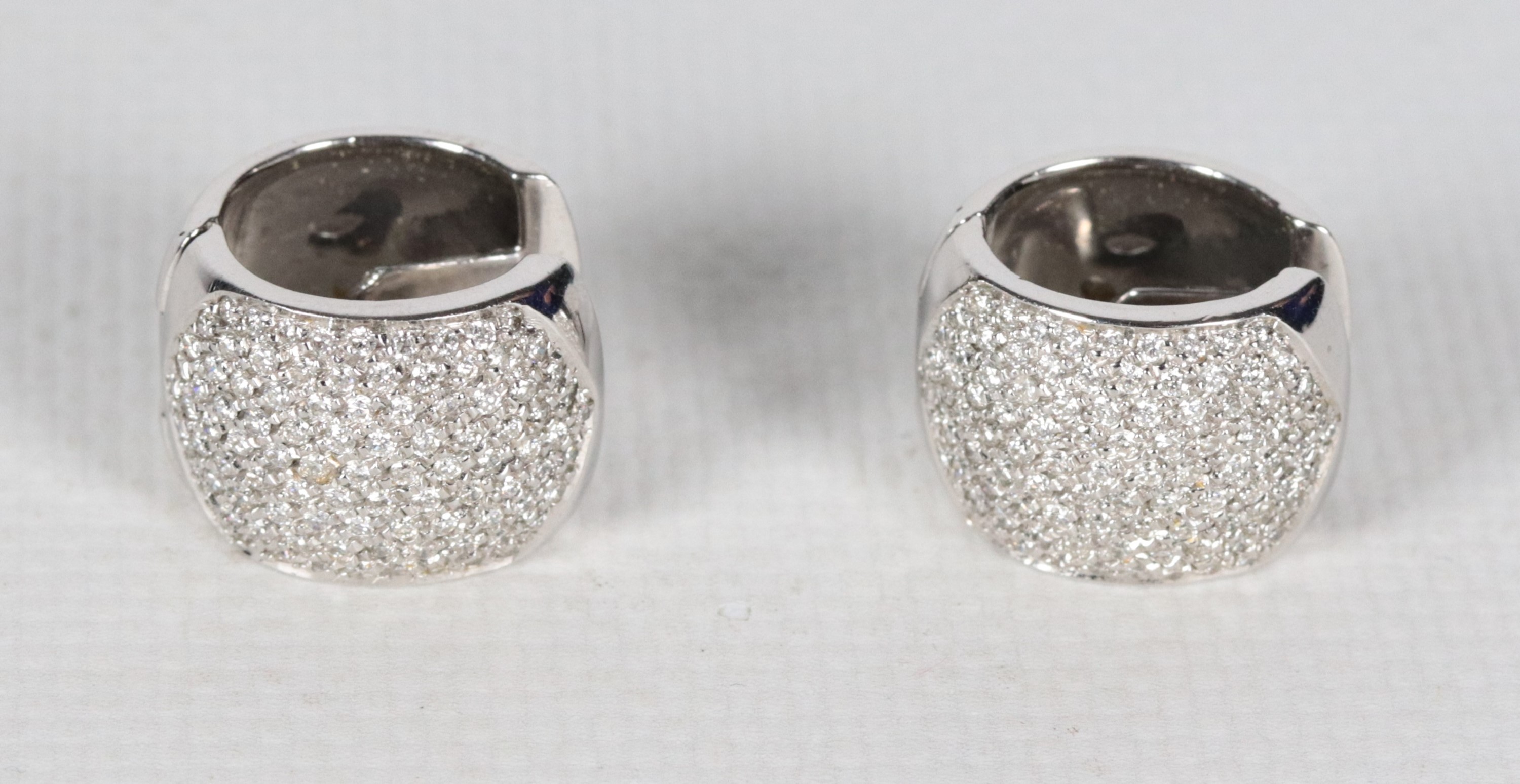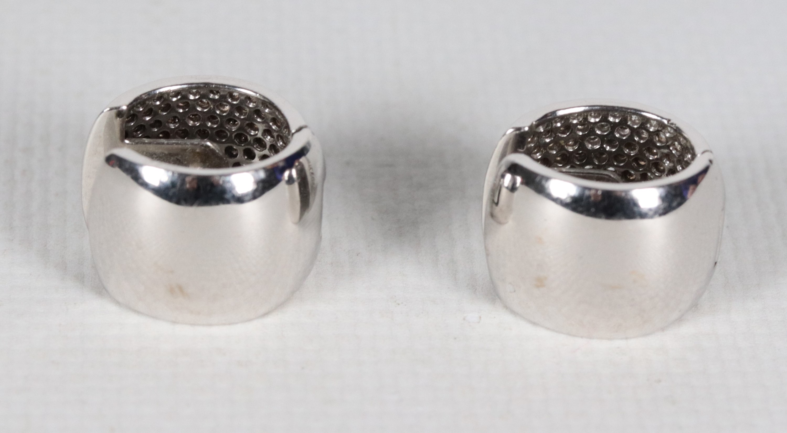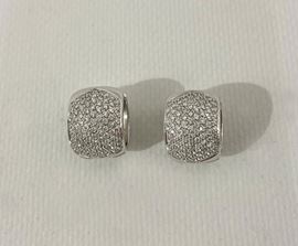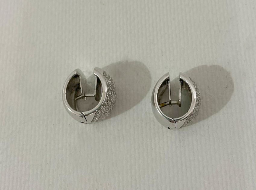 Coppia di orecchini a cerchio in oro bianco 18kt e pavè di diamanti taglio brillante. Peso lordo gr. 19,5