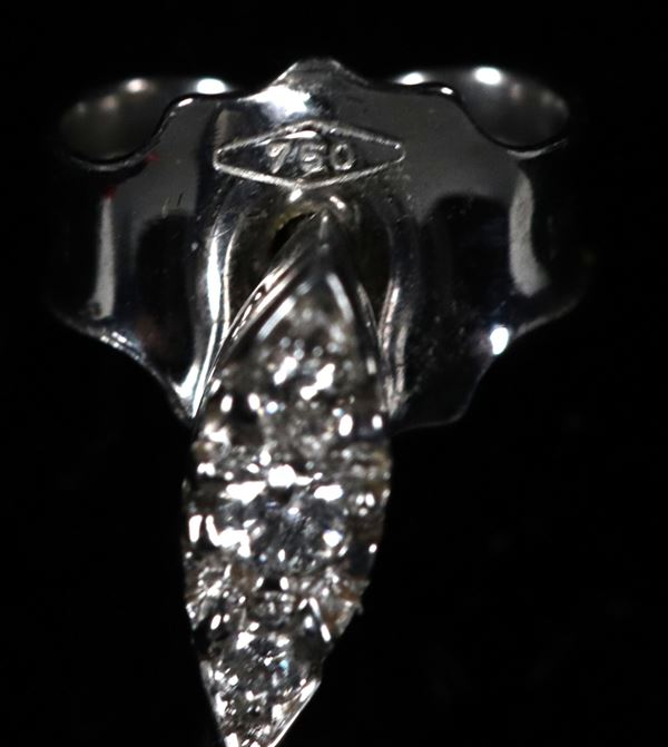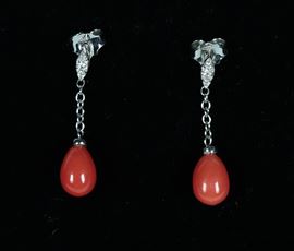 Coppia di orecchini in oro bianco 18kt, con coralli a goccia e piccoli diamanti. Peso lordo gr. 2,5