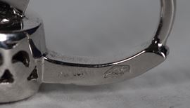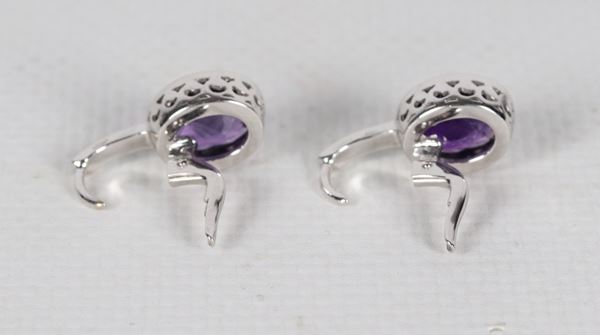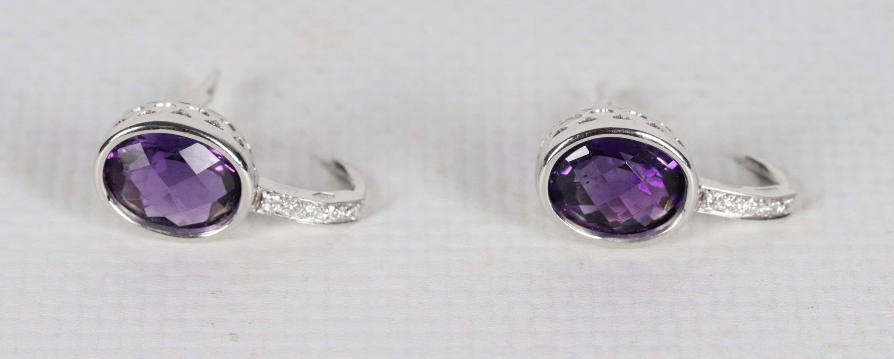 Coppia di orecchini in oro bianco 18kt, con piccoli diamanti e quarzi viola. Peso lordo gr. 4,5