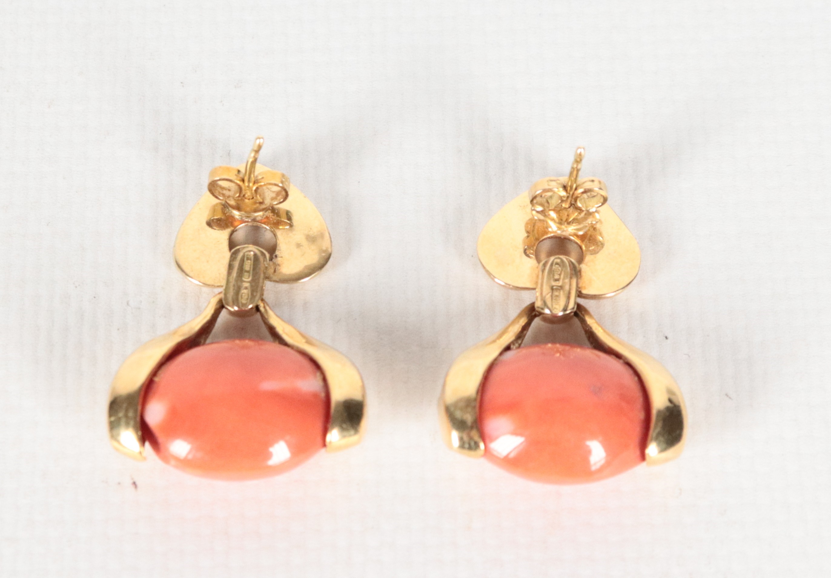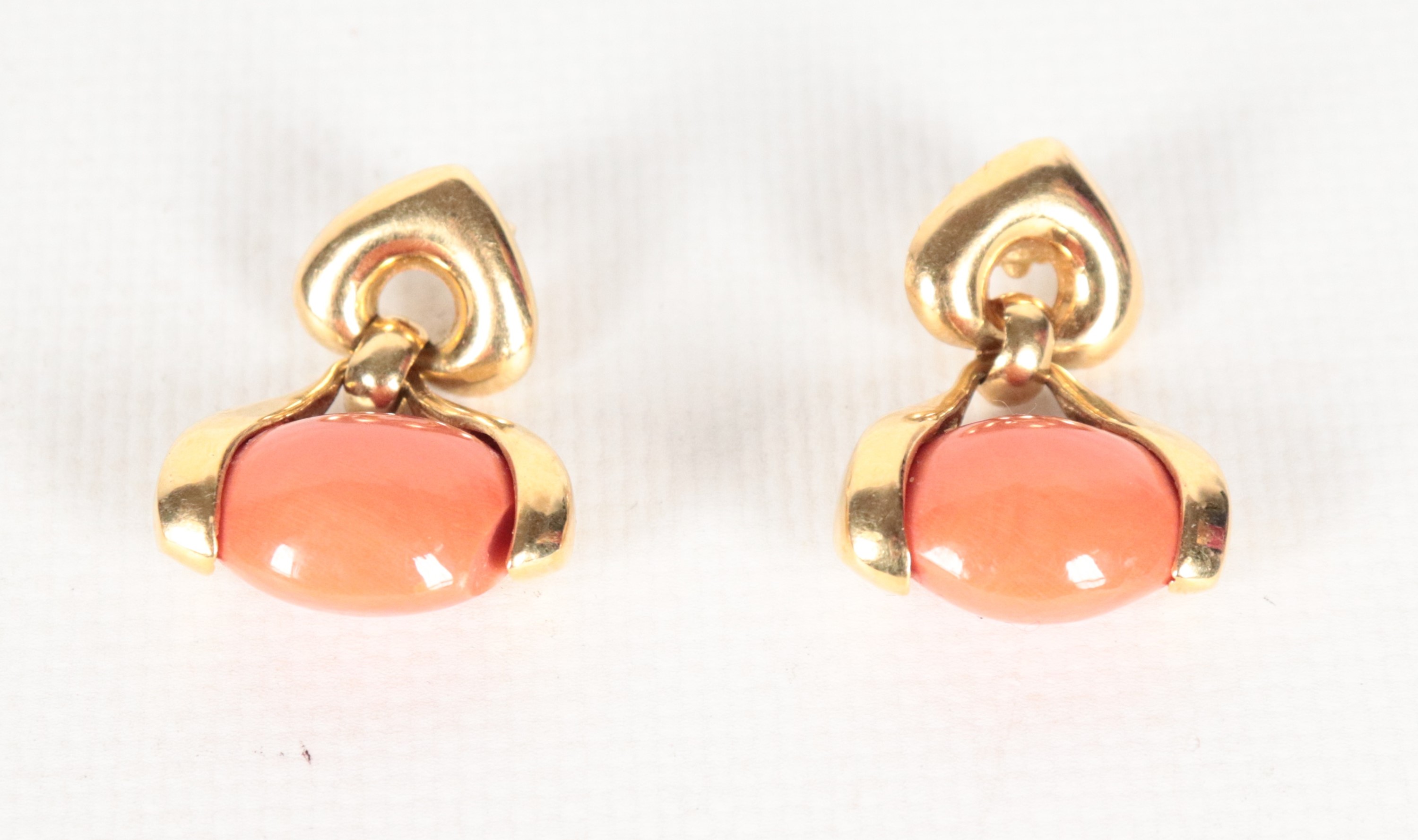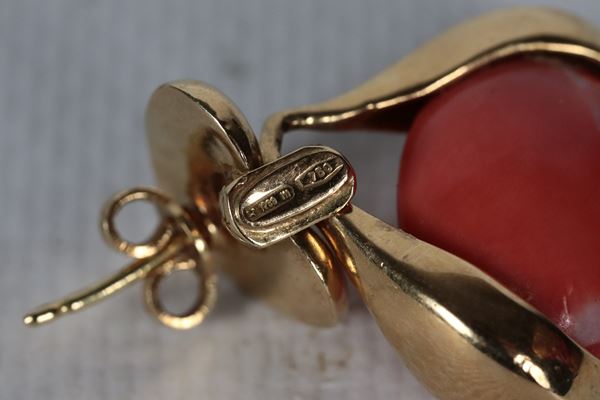Coppia di orecchini in oro giallo 18kt e coralli rosa con parti scheggiate. Peso lordo gr. 18,5