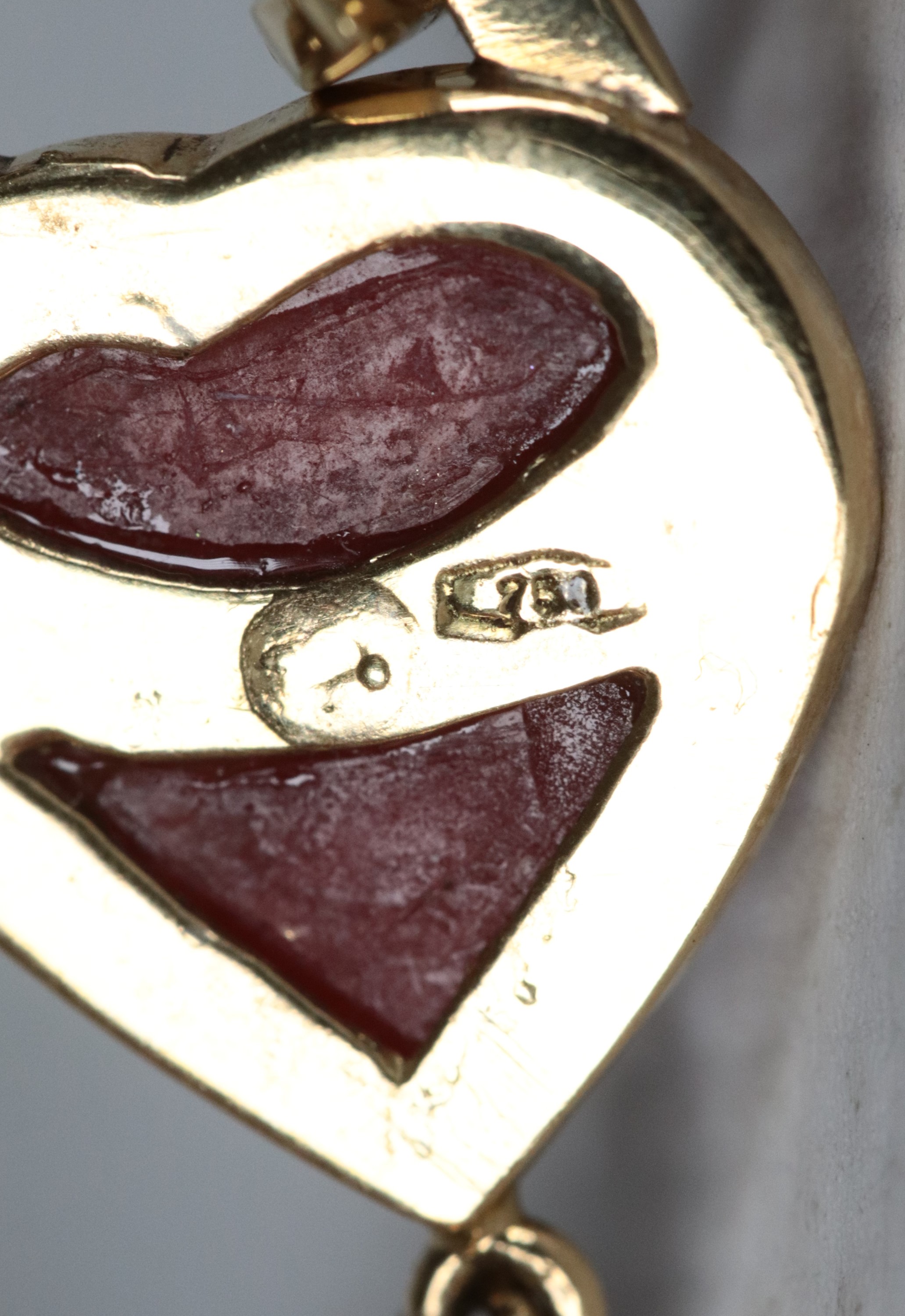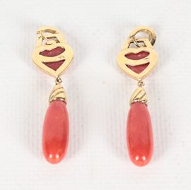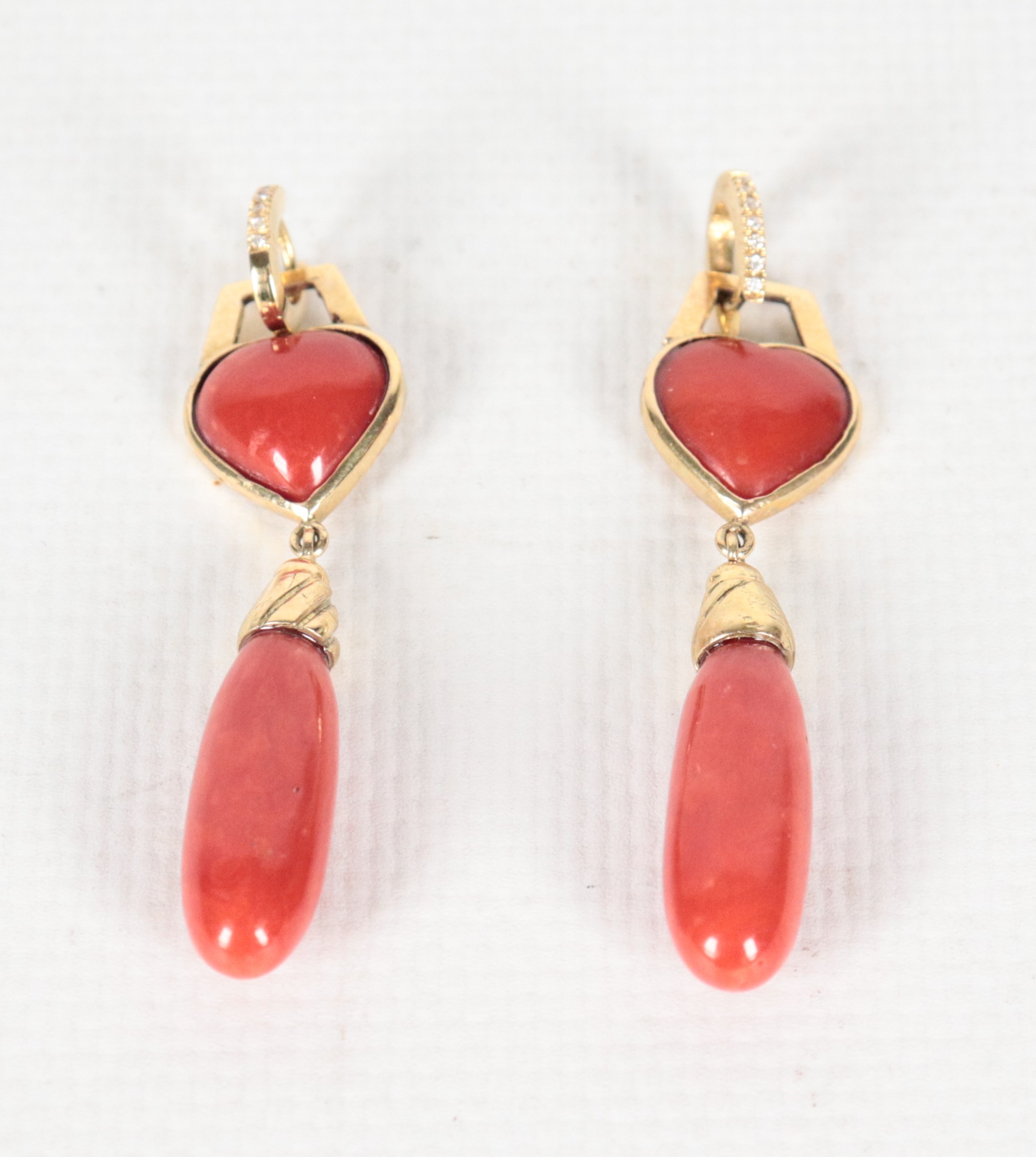 Coppia di orecchini in oro giallo 18kt e corallo rosso con piccoli diamanti. Peso lordo gr. 13