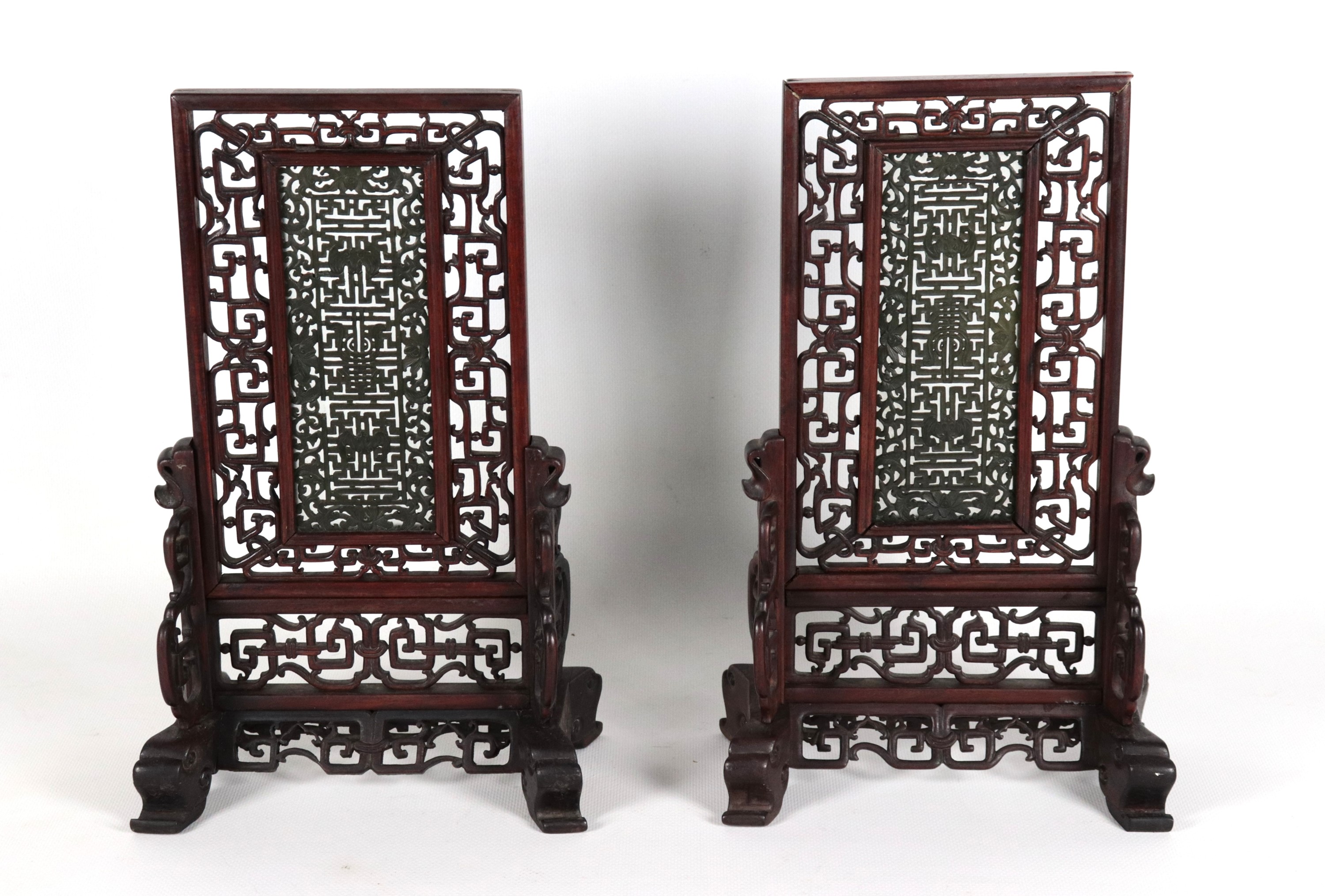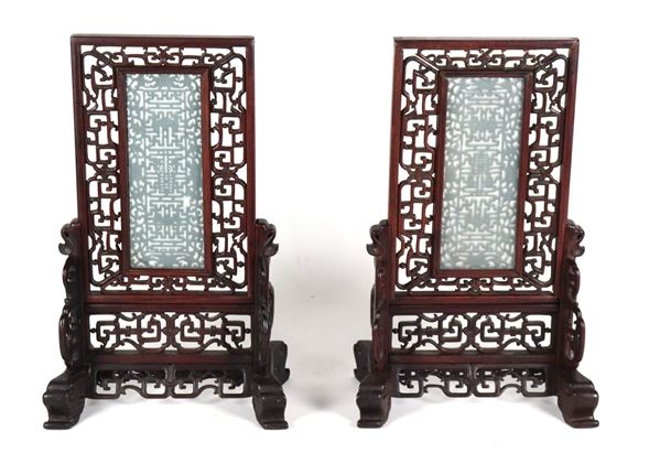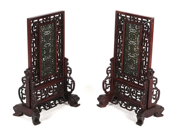 Coppia di paravento da tavolo cinesi in legno di teak intagliato e traforato
