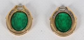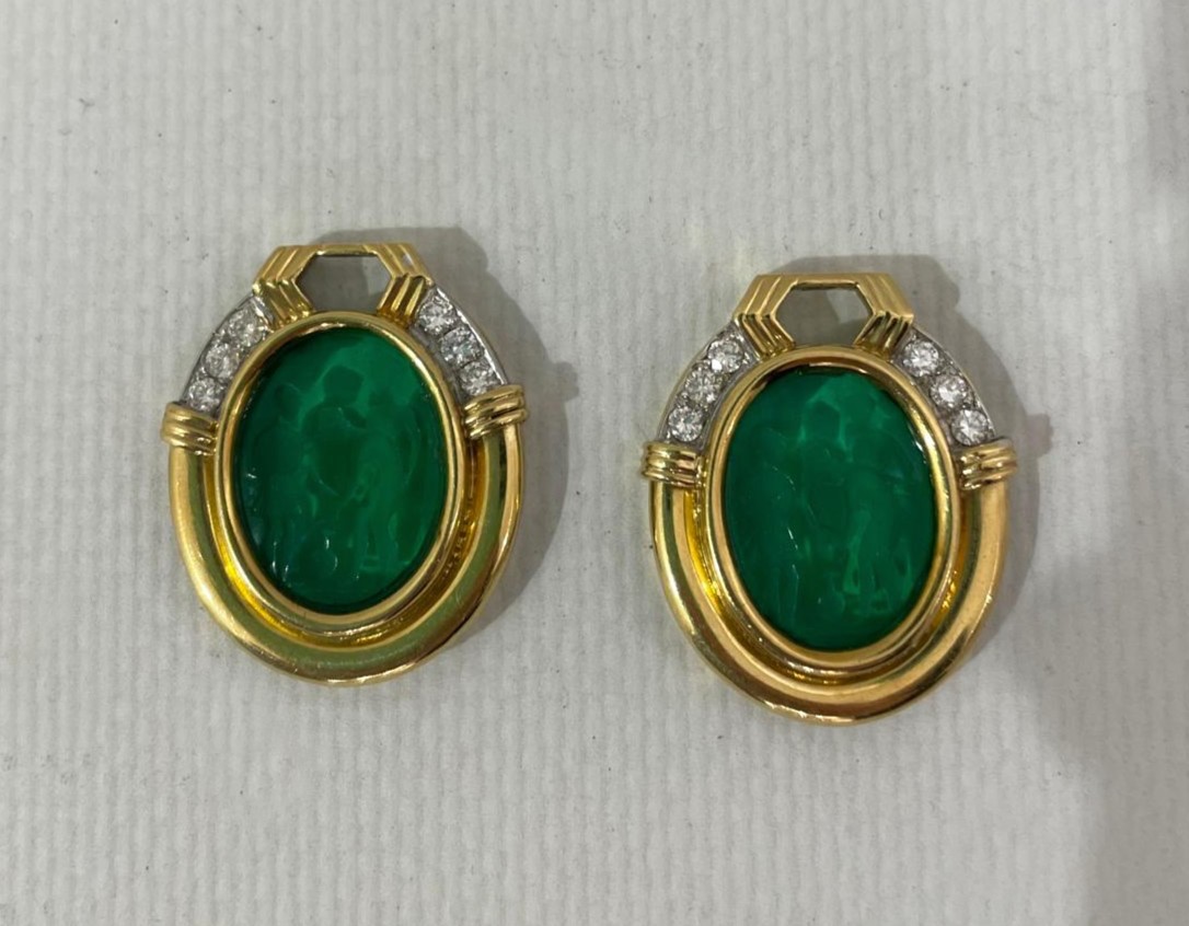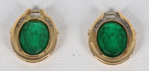 Coppia di pendenti per orecchini in oro giallo 18kt, con paste vitree verdi incise e piccoli diamanti ct 0,40 circa. Peso lordo gr. 18,5.