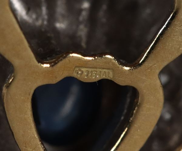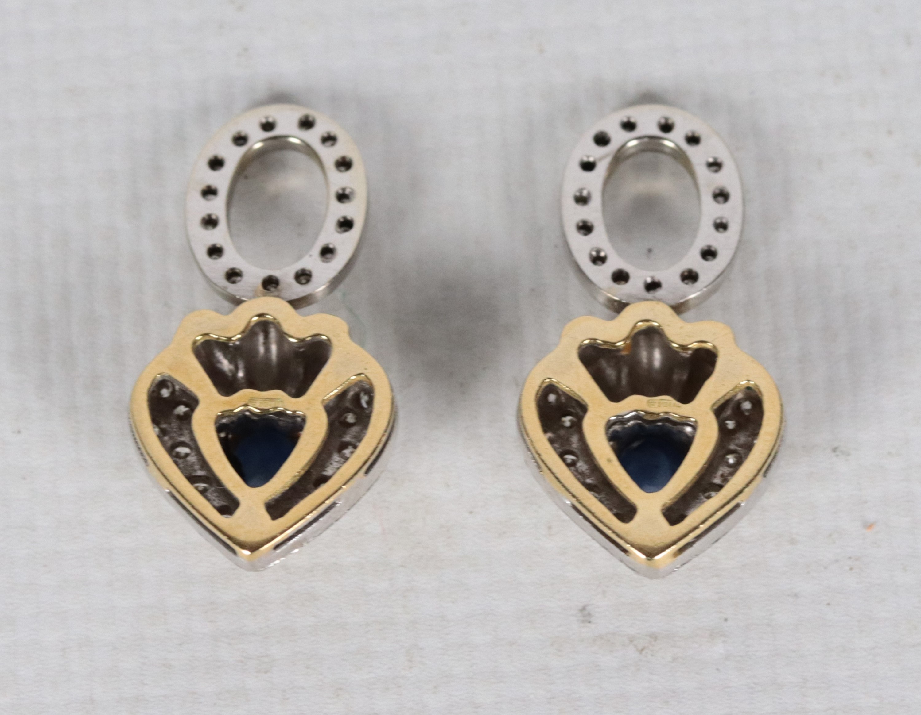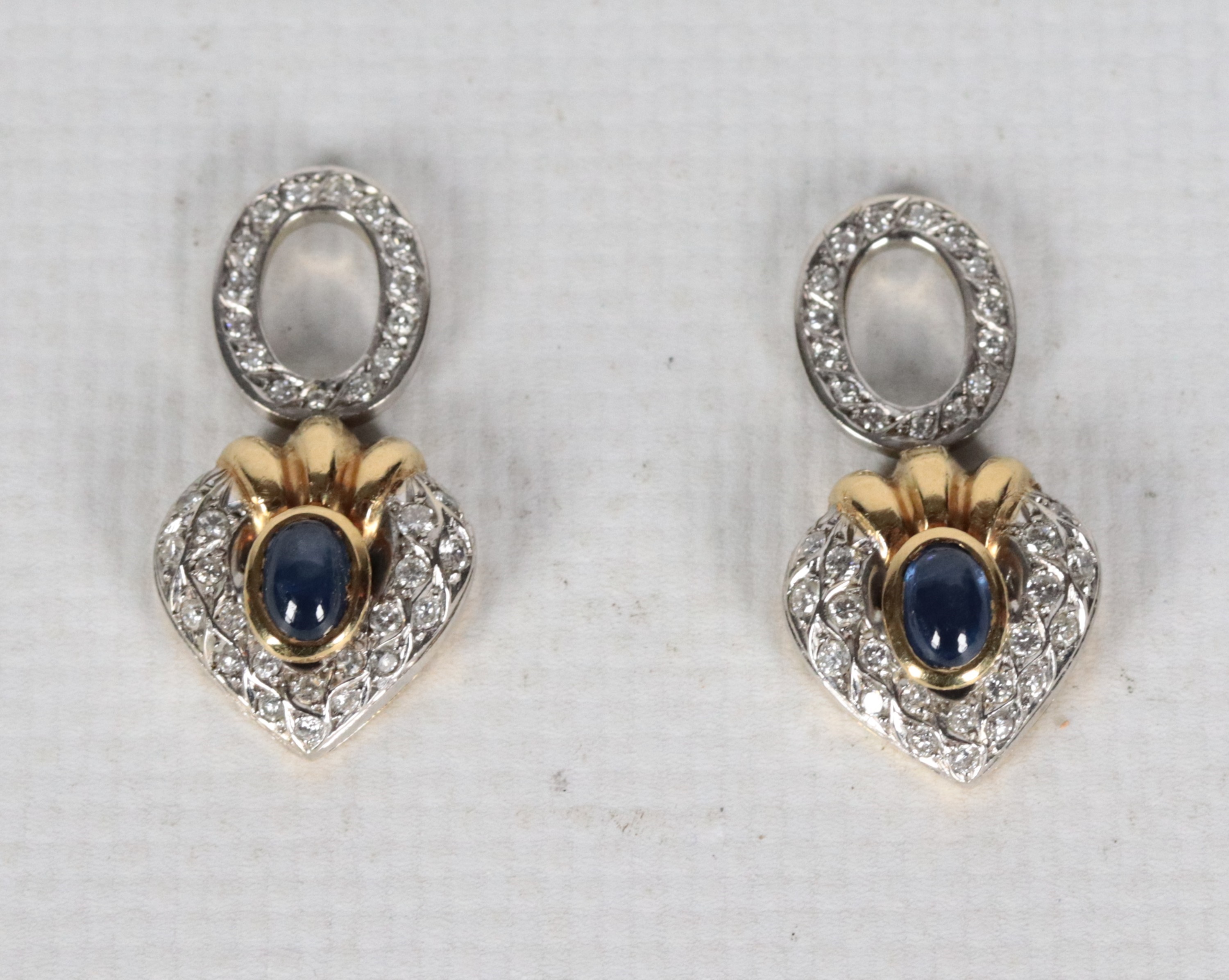 Coppia di pendenti per orecchini in oro giallo e bianco 18kt, con piccoli diamanti taglio brillante e pietre azzurre cabochon. Peso lordo gr. [..]