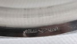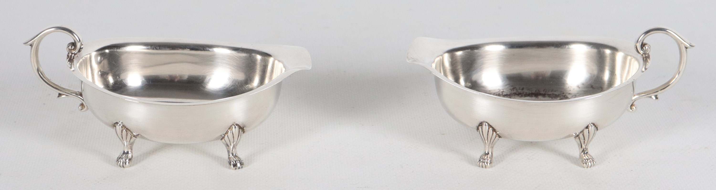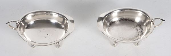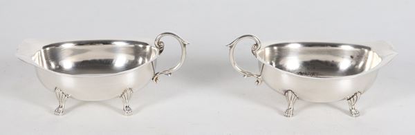 Coppia di piccole salsiere a barchetta in argento con manici e quattro piedini, gr. 150