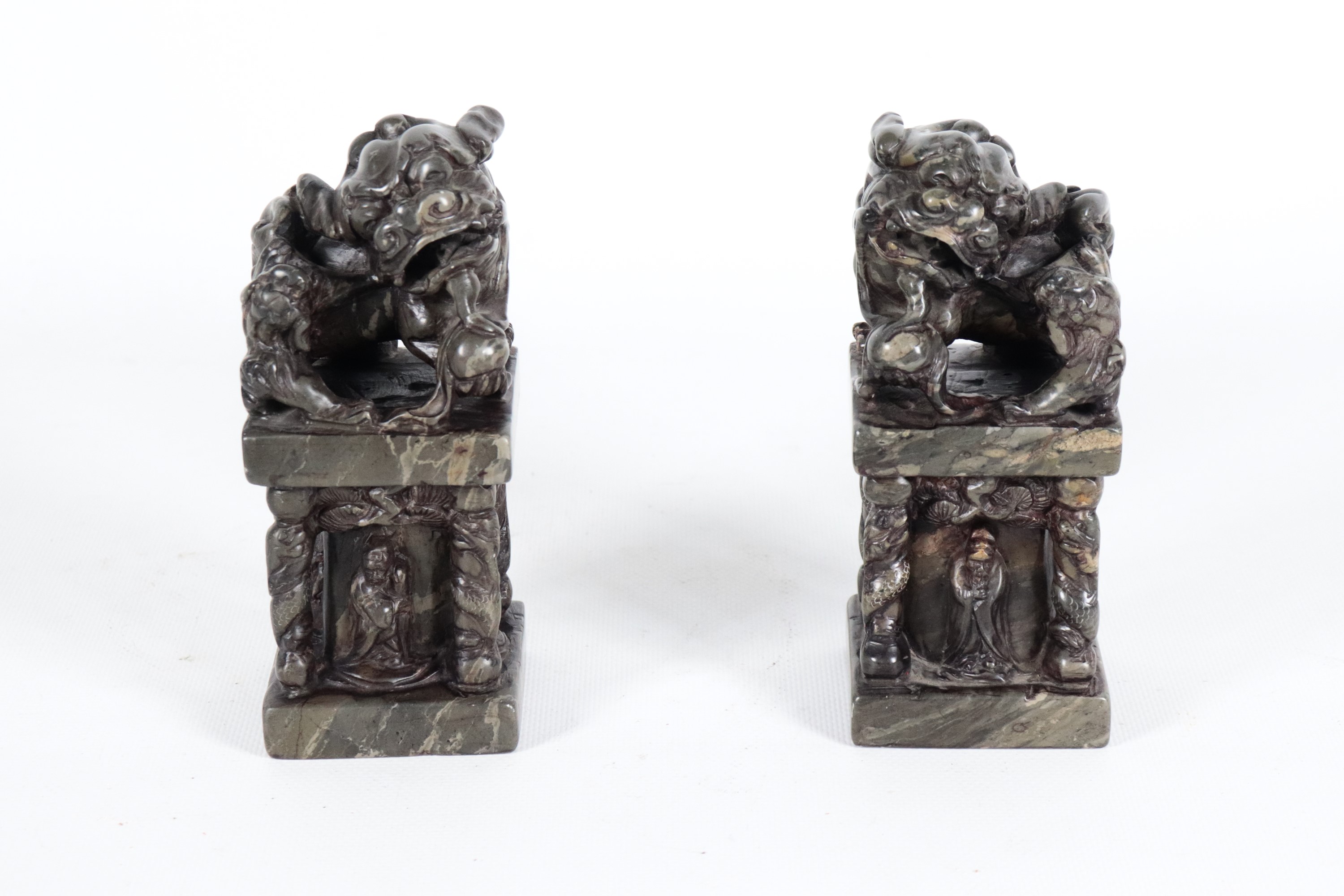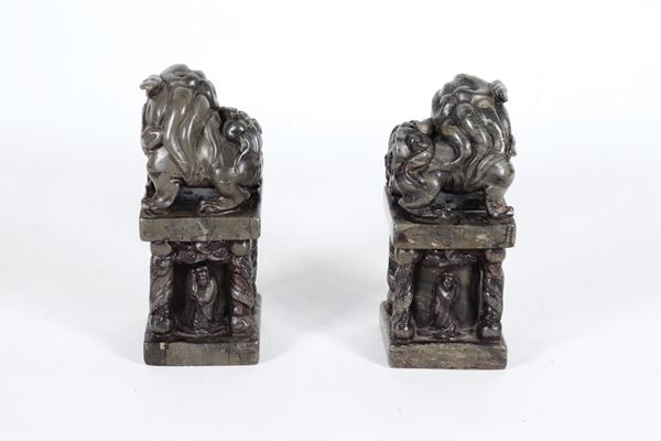 Coppia di sigilli cinesi in pietra dura, sormontati da piccole sculture di Cani Foo