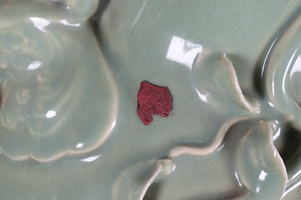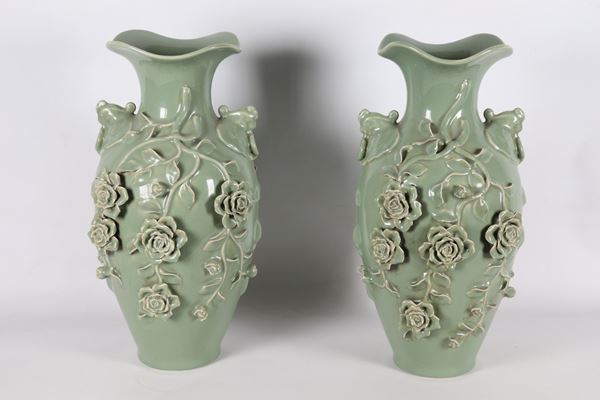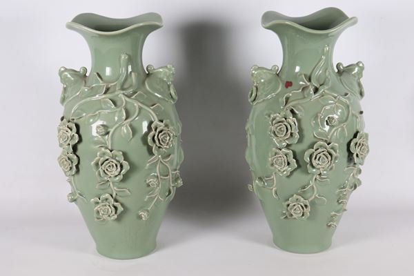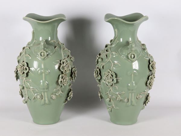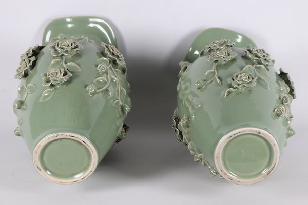 Coppia di vasi cinesi in porcellana Celadon, con decorazioni di fiori a rilievo