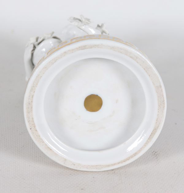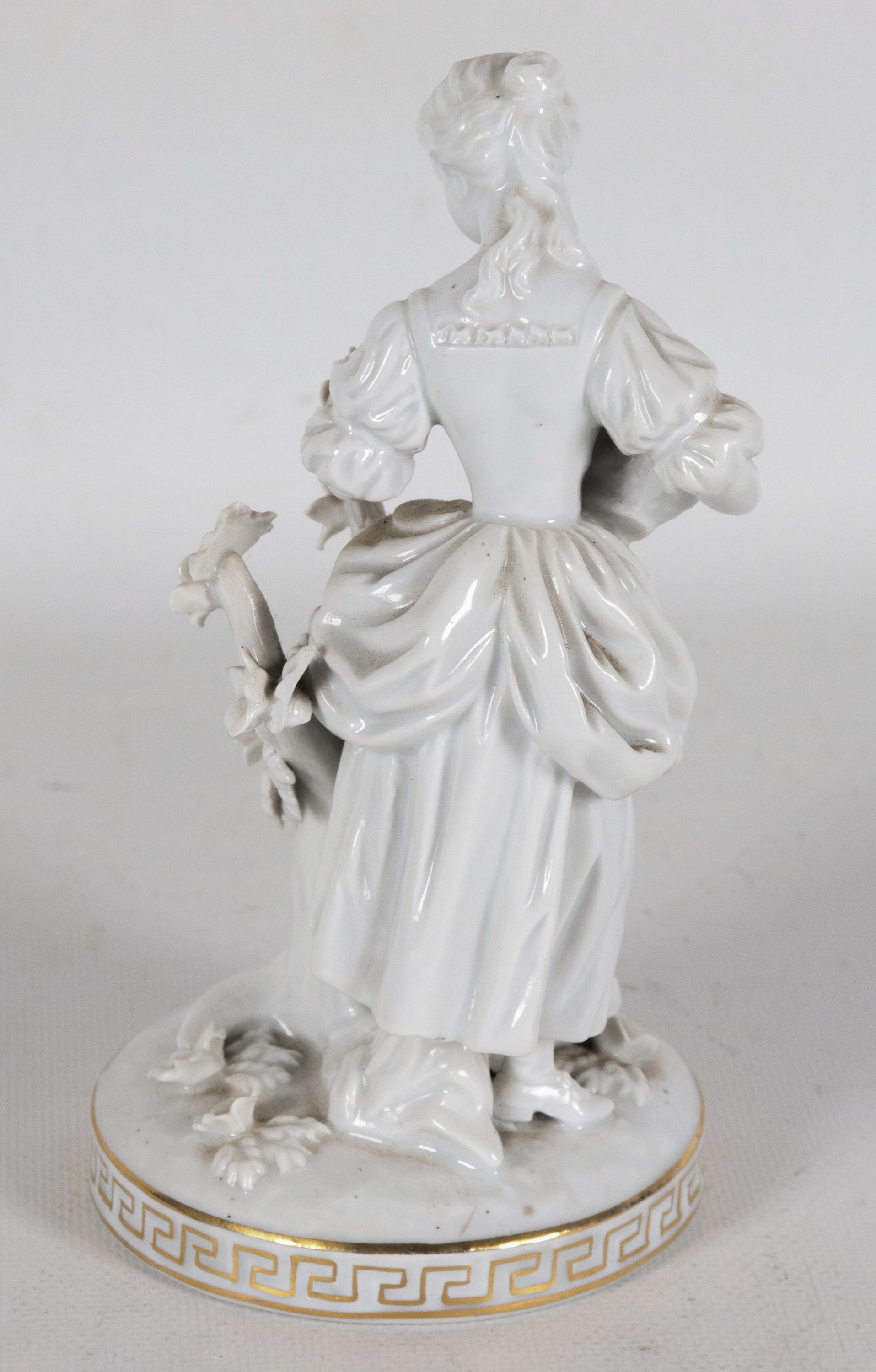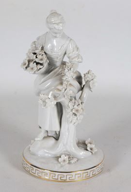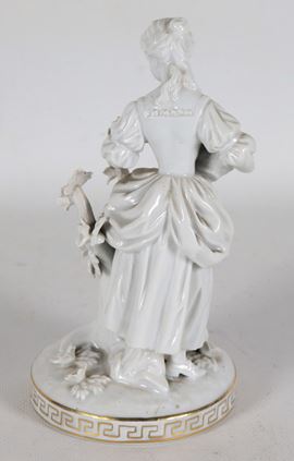 "Damina con cesto e ghirlande di fiori", antica statuina in porcellana bianca smaltata