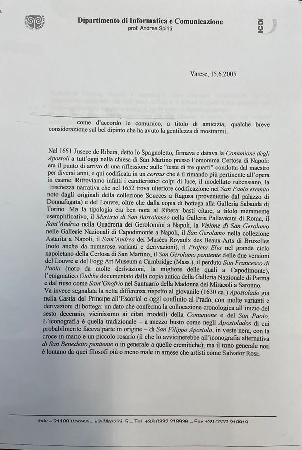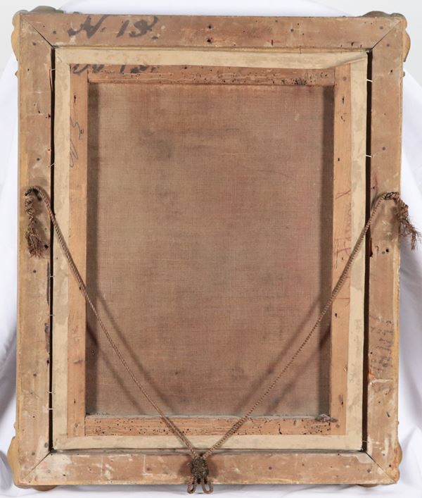 dipinto ad olio su telaSi allega comunicazione del Professor Andrea Spiriti del 15/6/2005. Cornice in legno dorato e intagliato di epoca posteriore, cm 58 x 45,5.