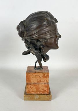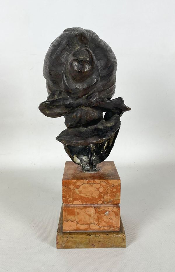 "Dea bendata", scultura in bronzo sorretta da base in marmo brecciato