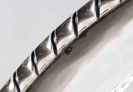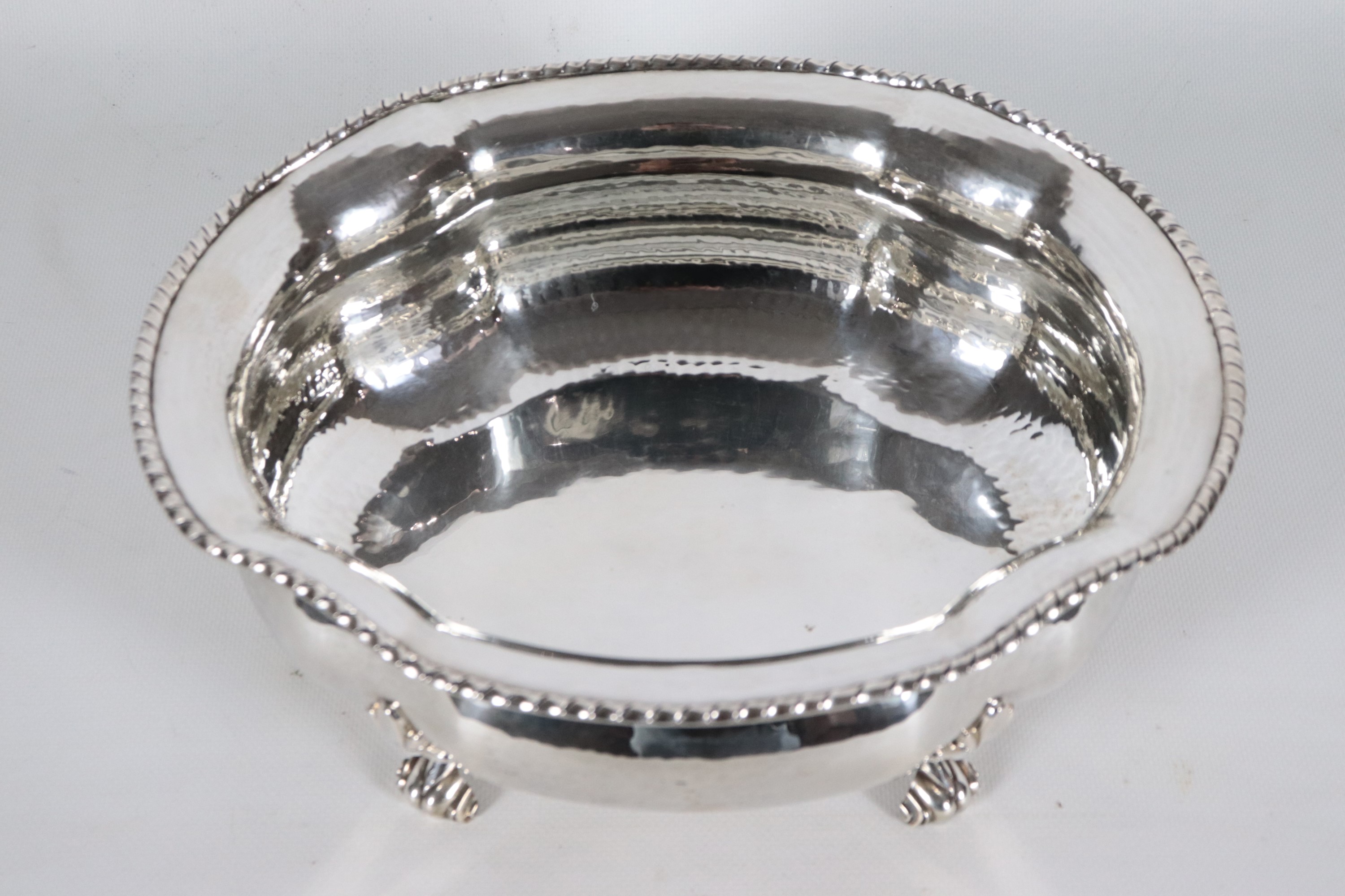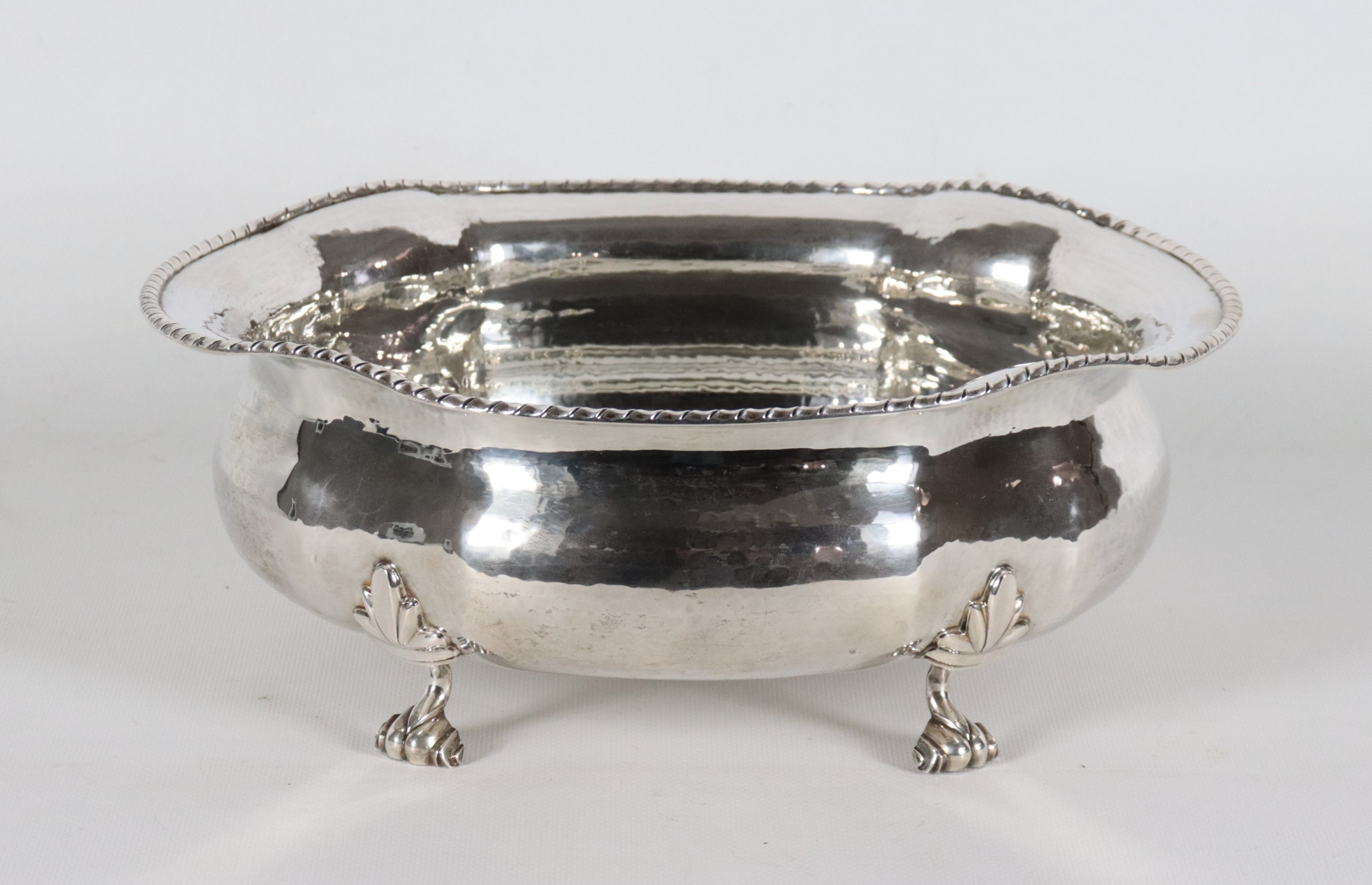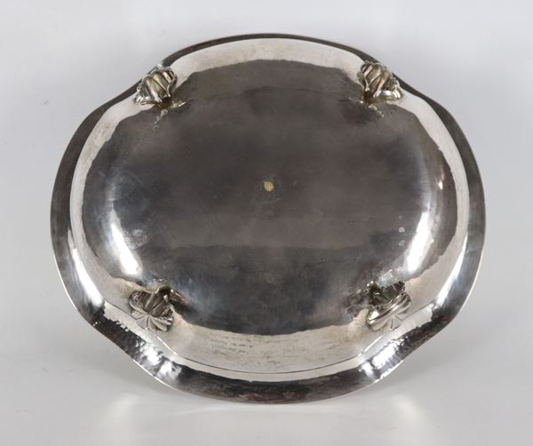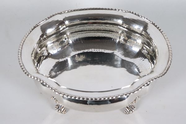 Fruttiera ovale in argento con bordo centinato, cesellato e sbalzato, sorretta da quattro piedini leonini, gr. 990