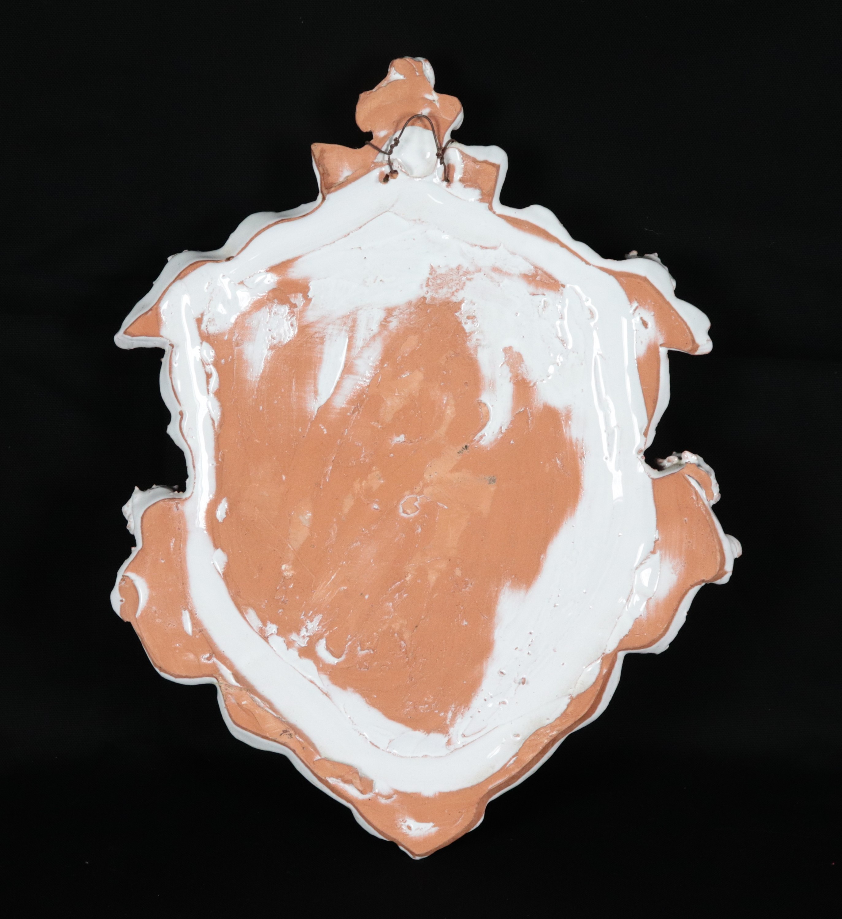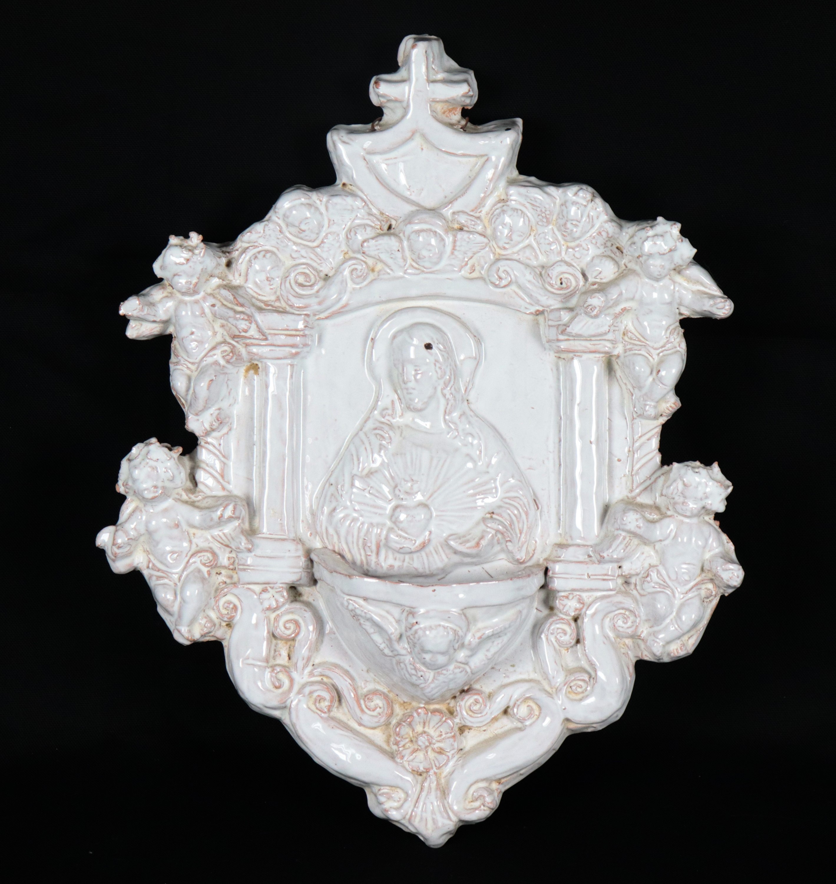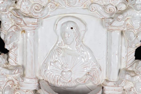 "Gesù con Sacro Cuore e angeli", acquasantiera in terracotta porcellanata e smaltata bianca