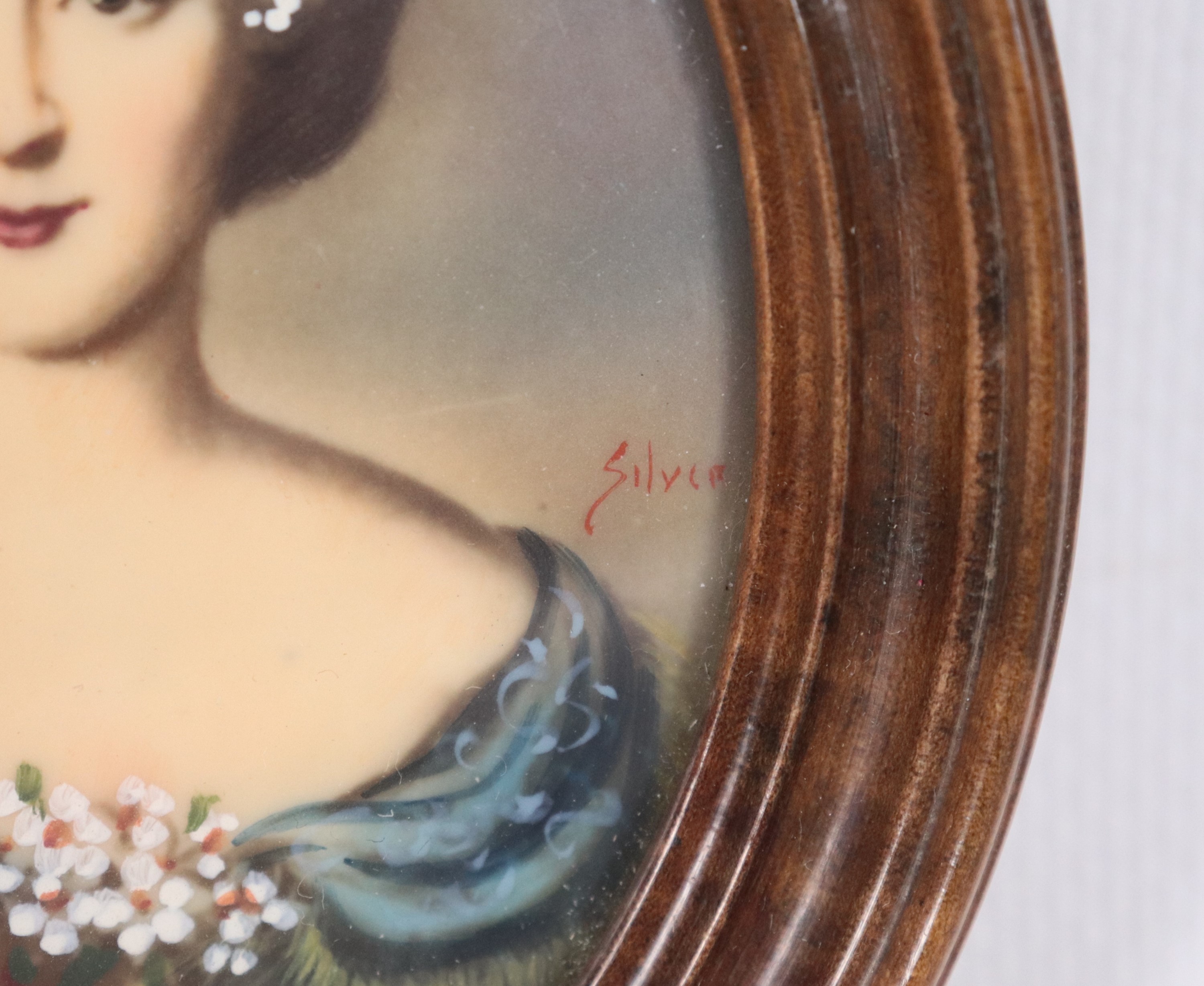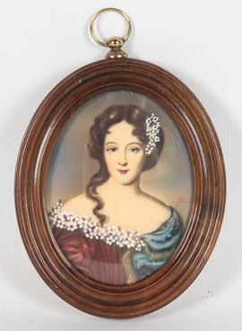 "Giovane dama con fiori", miniatura ovale dipinta in cornicetta in noce