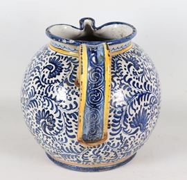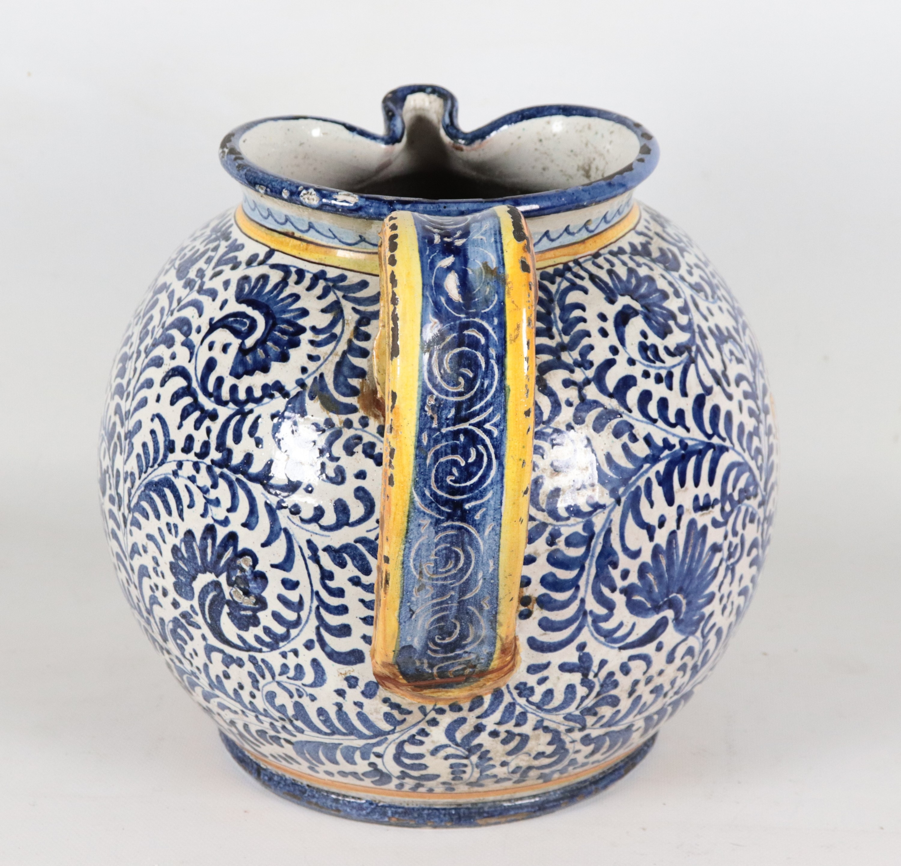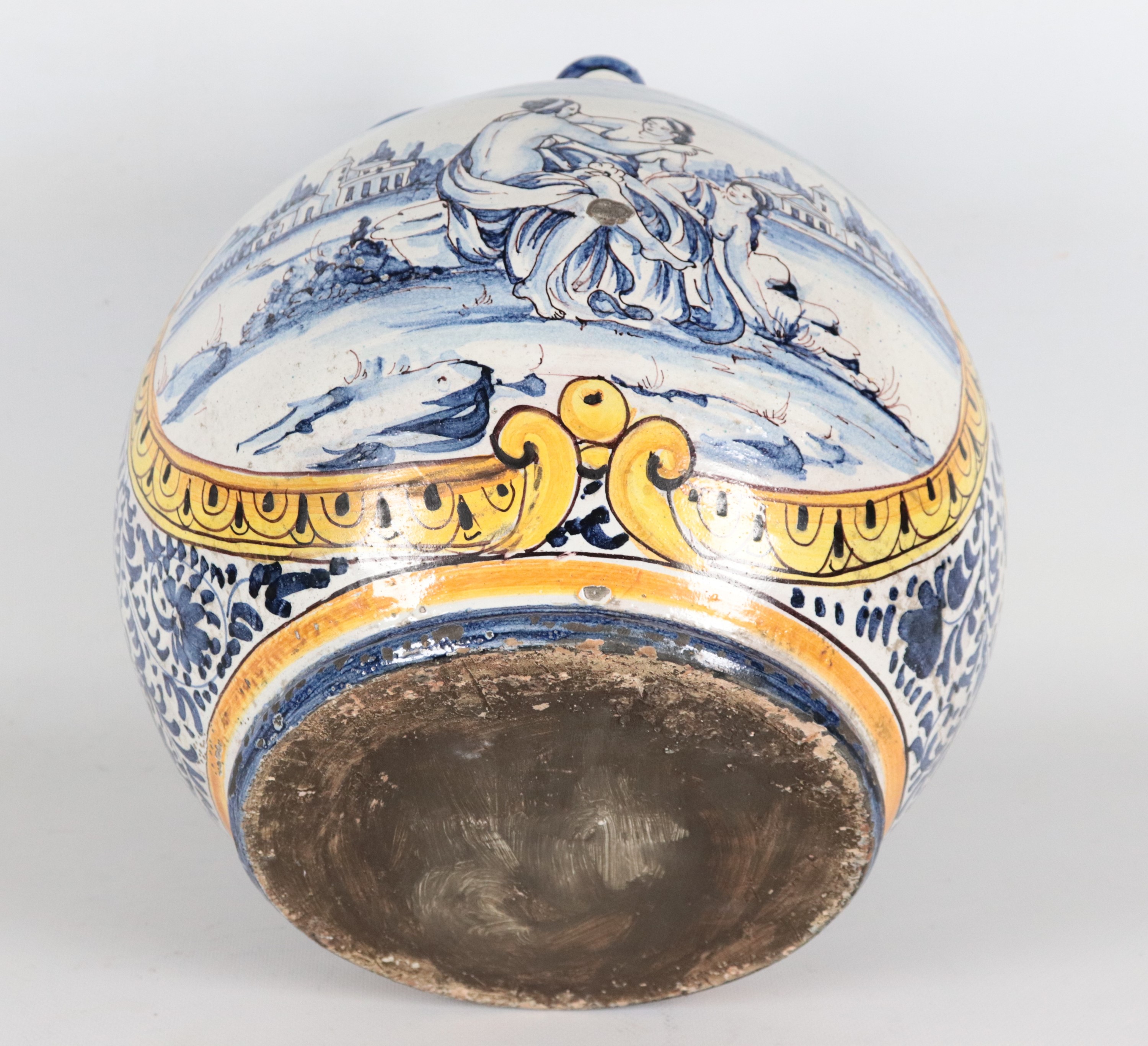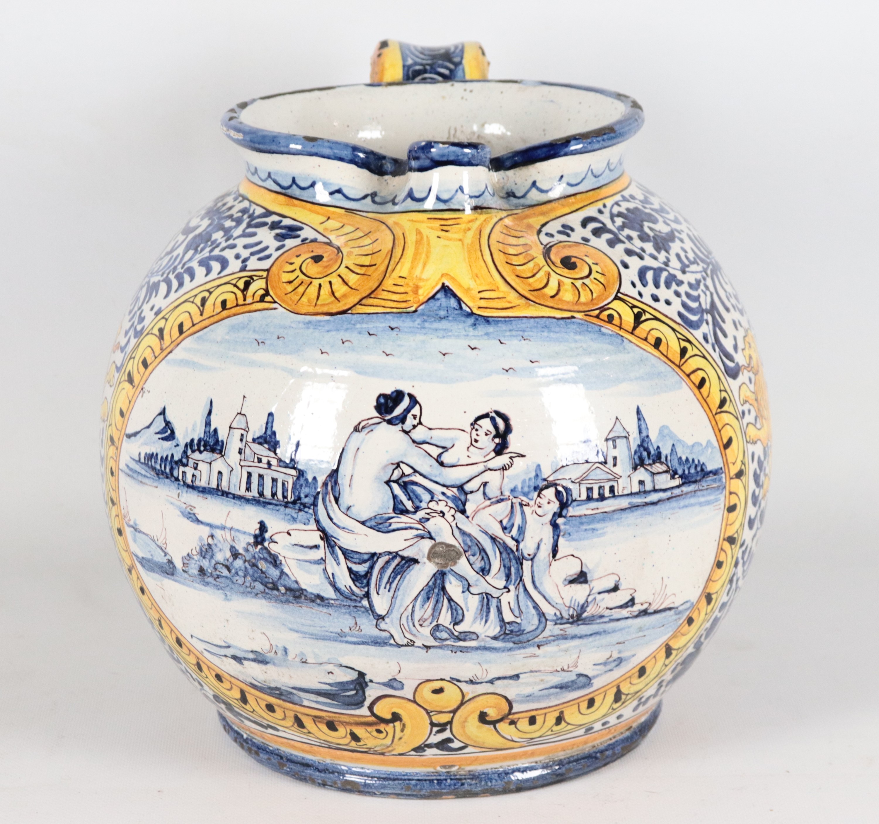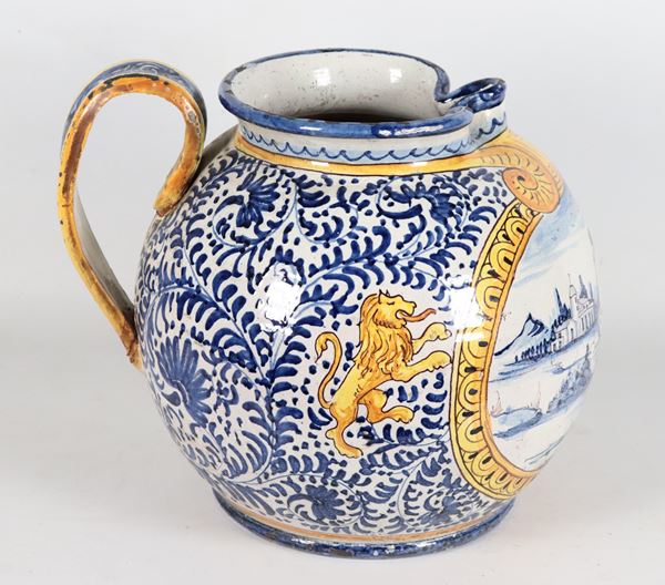 Grande brocca in maiolica smaltata Deruta, con decori in blu e giallo e scena con paesaggio e vestali