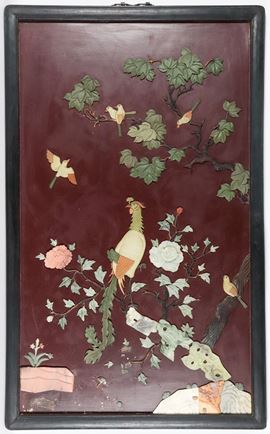 Grande pannello cinese in legno laccato rosso, con decorazioni a rilievo in pietre dure e giada di uccelli esotici e alberi