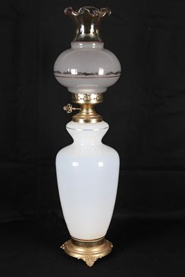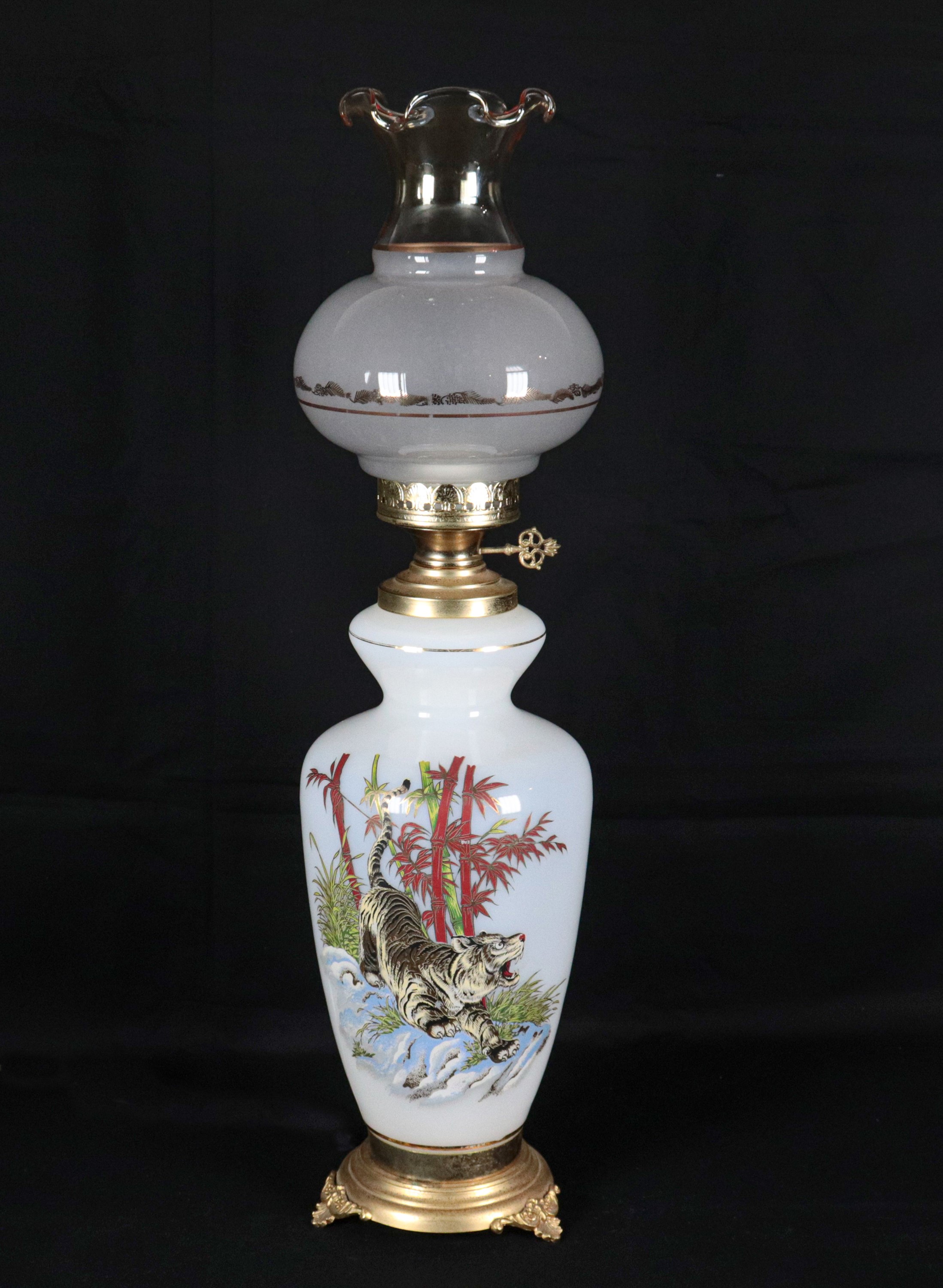 Lampada a petrolio in vetro lattimo, con decorazione smaltata a rilievo di tigre e canne di bamboo, base in metallo dorato