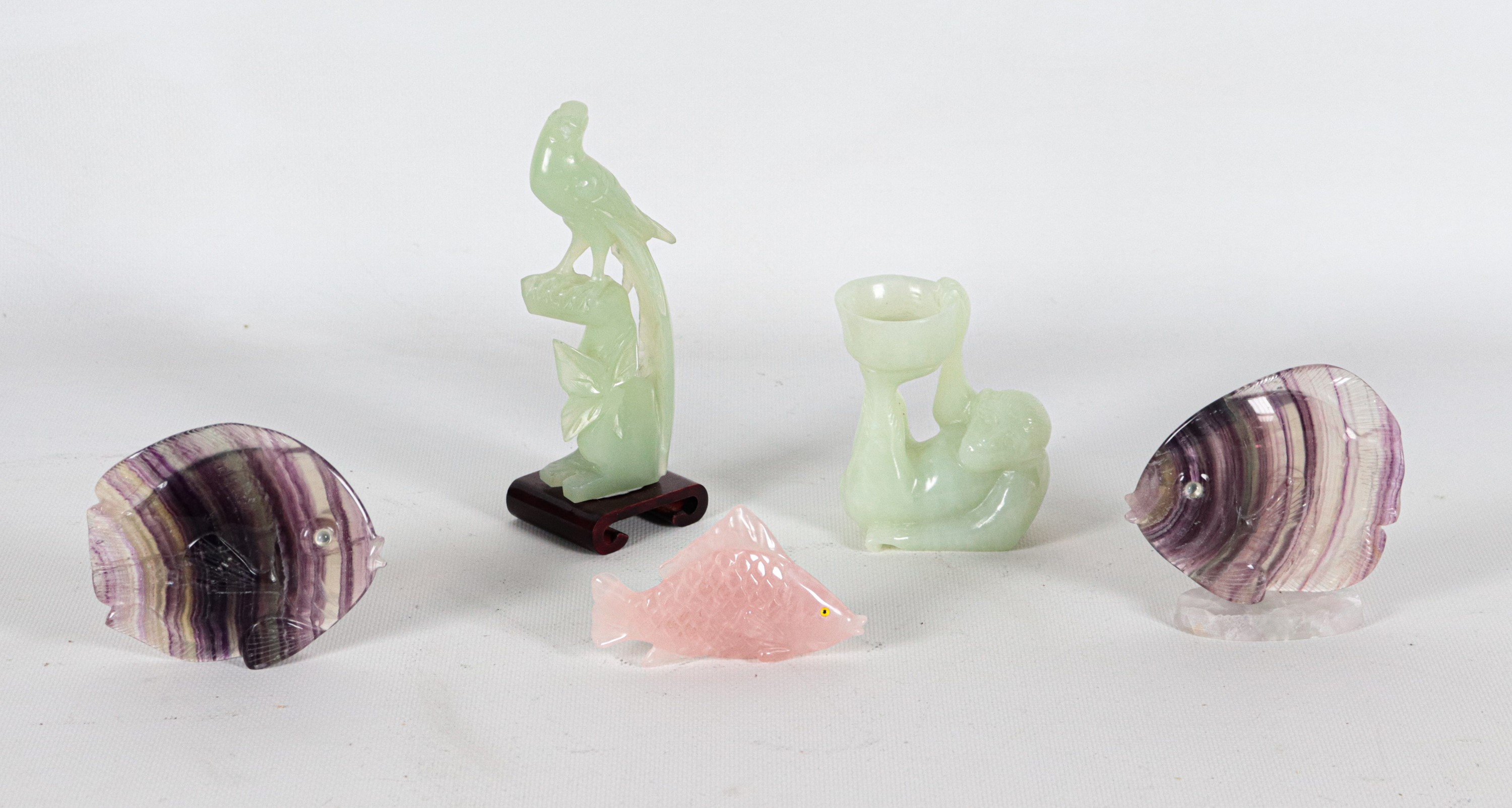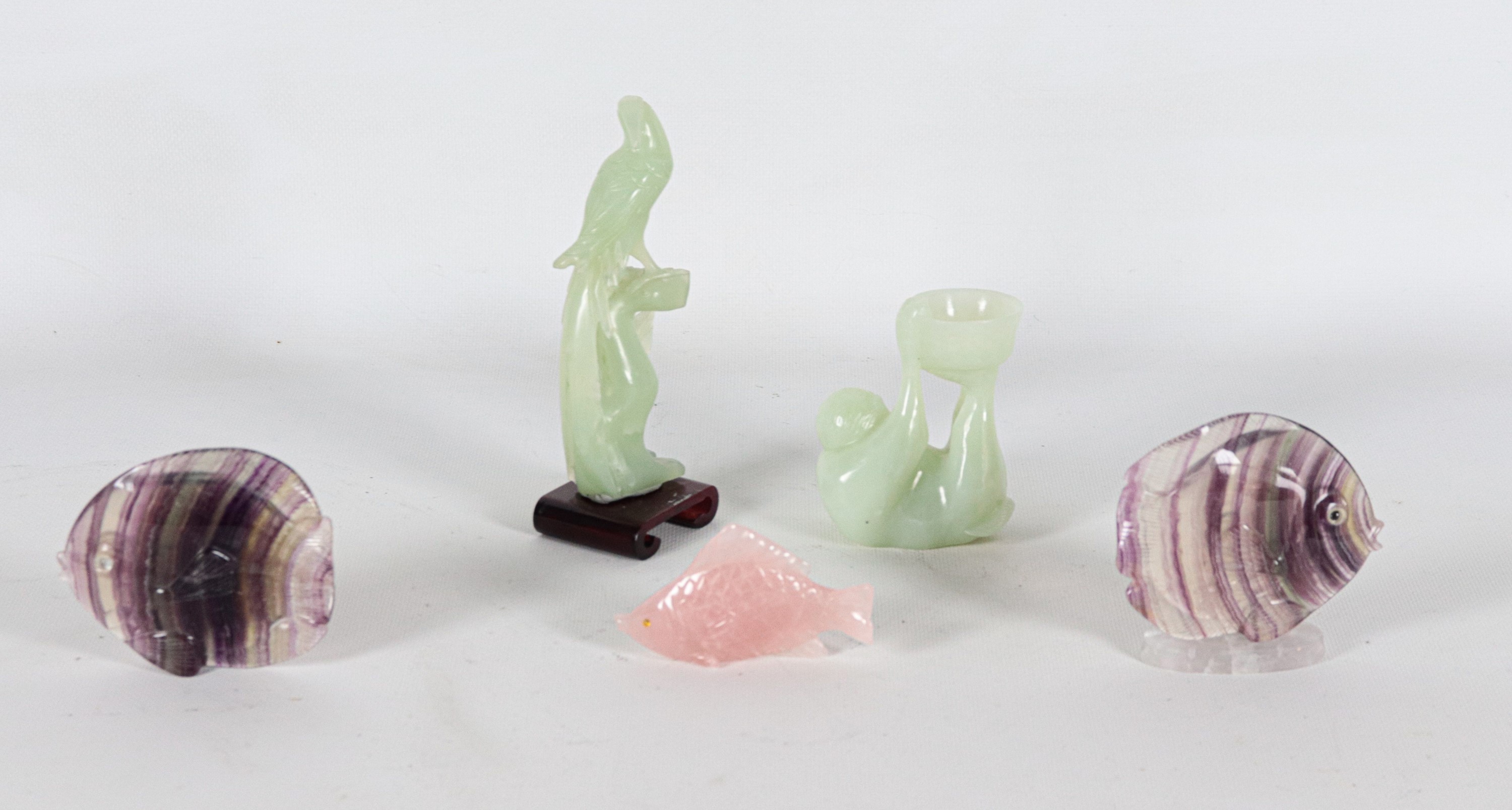 Lotto cinese in giada verde e quarzo di un uccellino, una scimmietta e tre pesciolini (5 pz.)