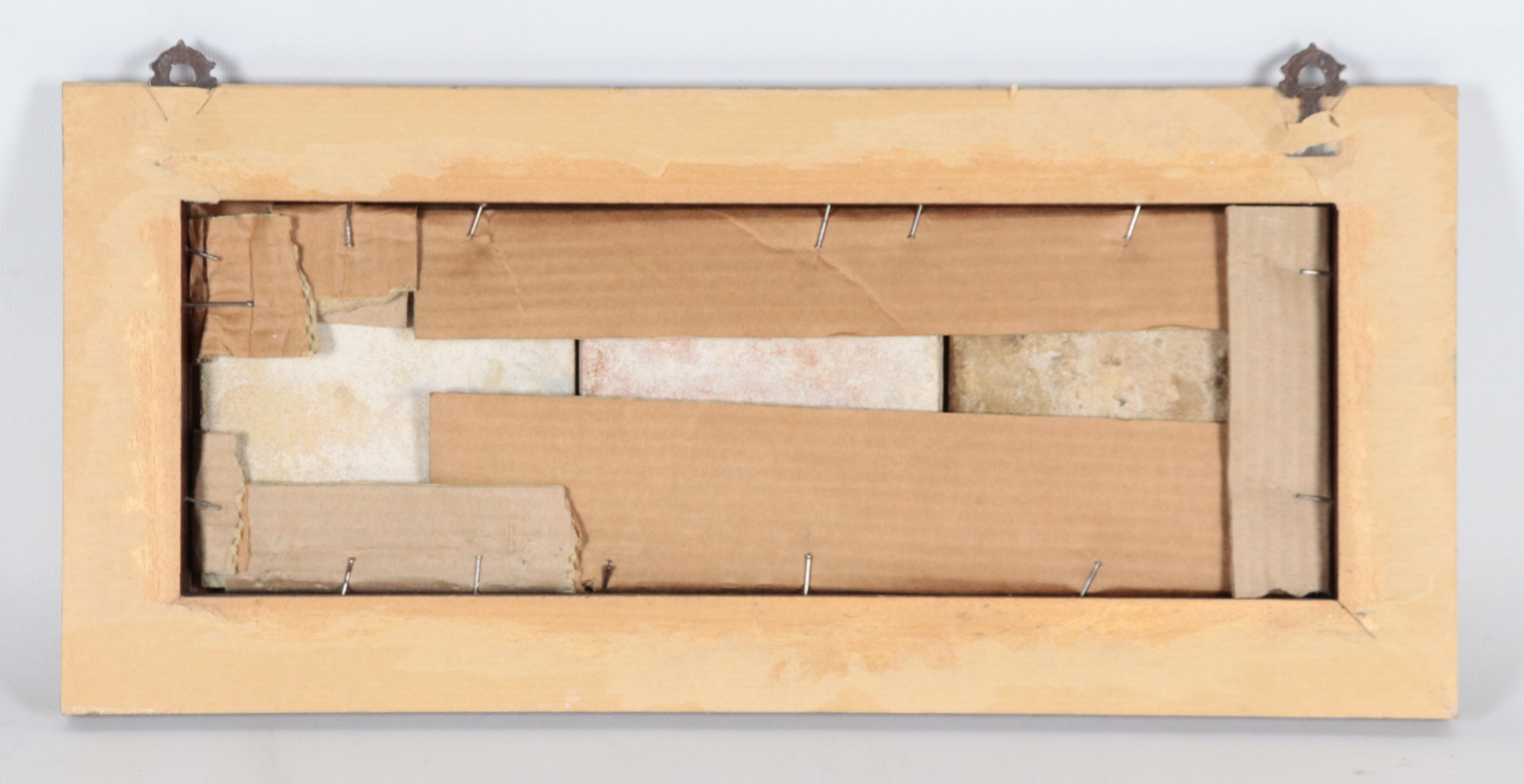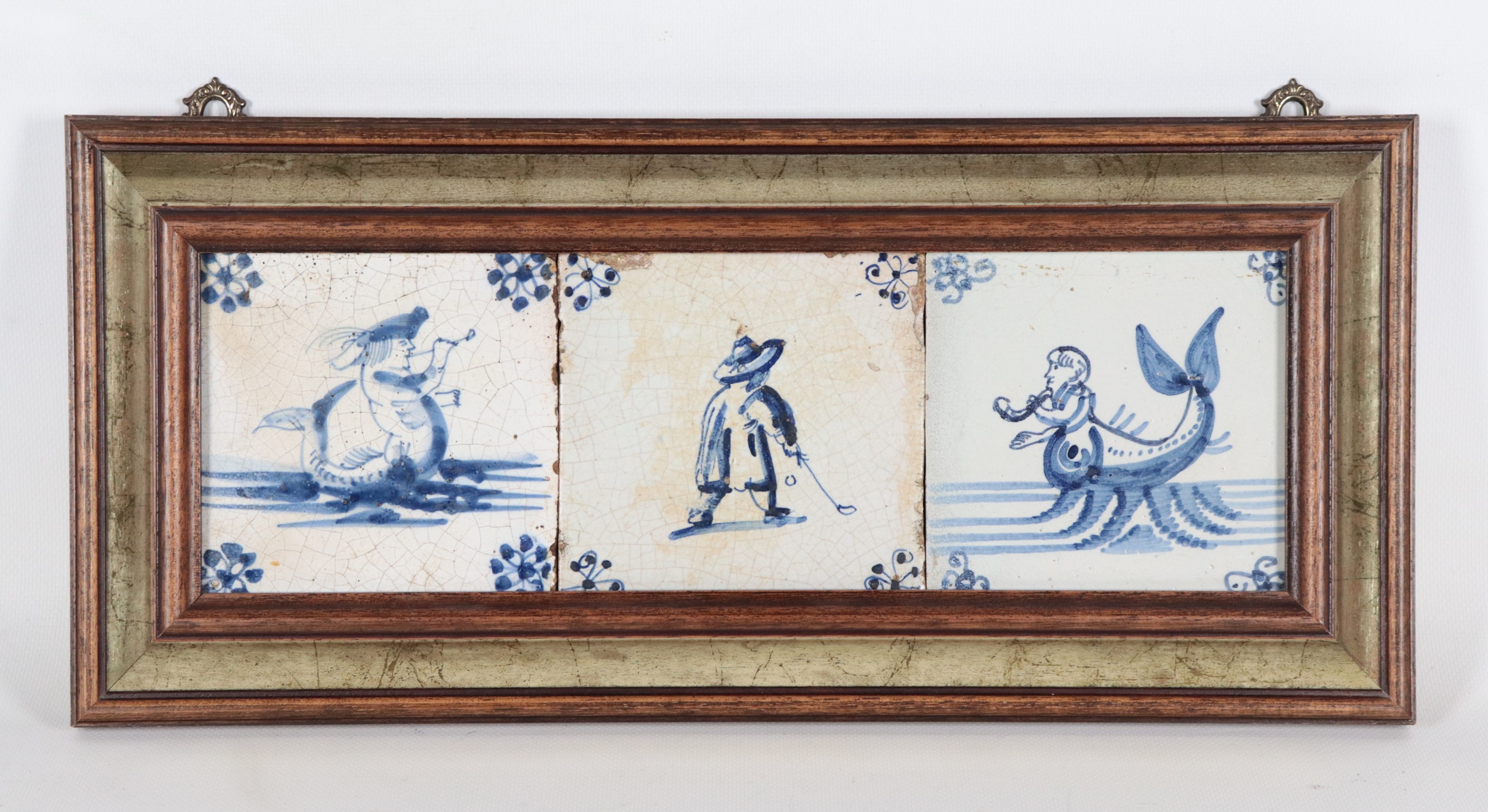 Lotto di tre antiche mattonelle in maiolica, con decorazioni in blu di personaggi, riunite in un'unica cornice