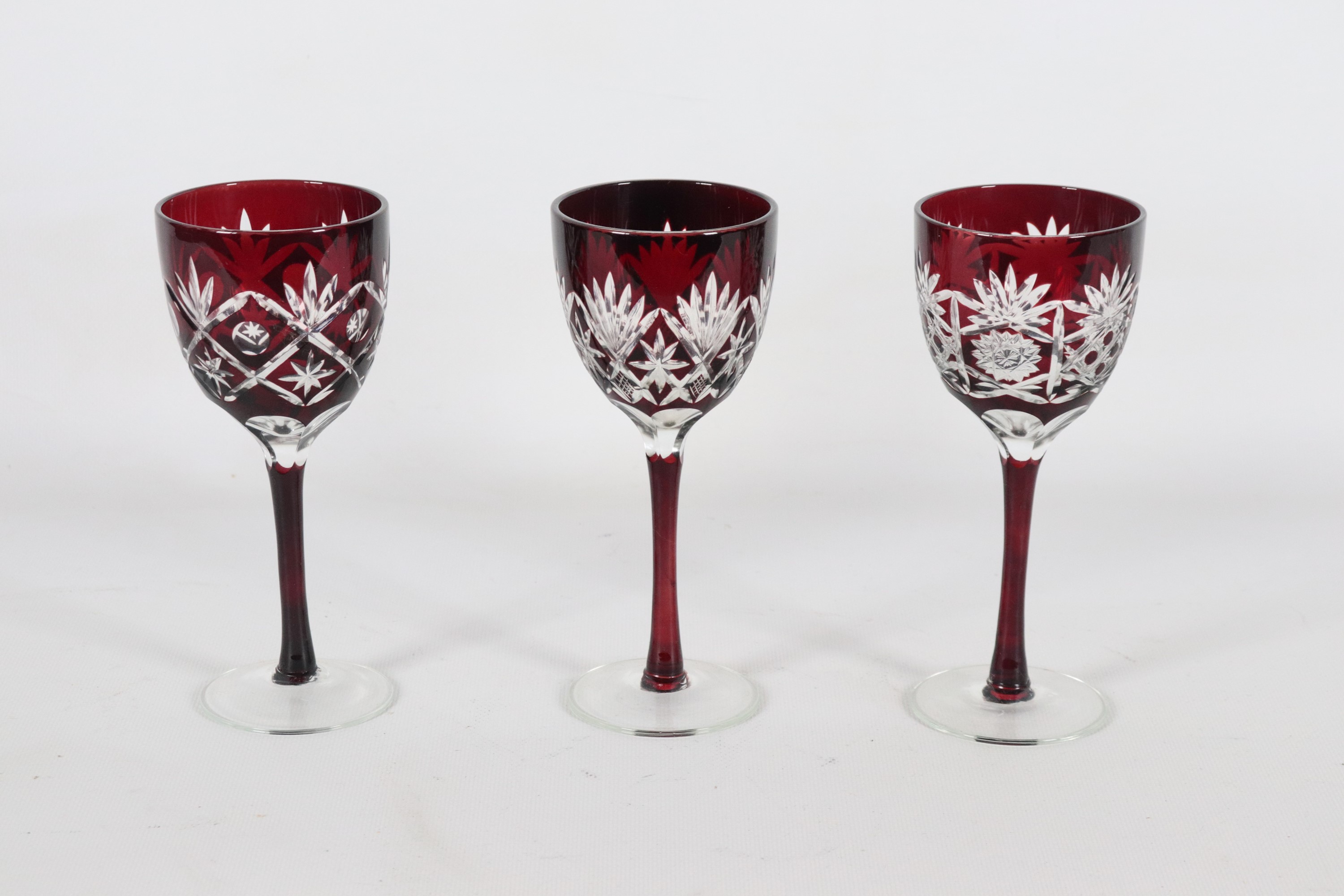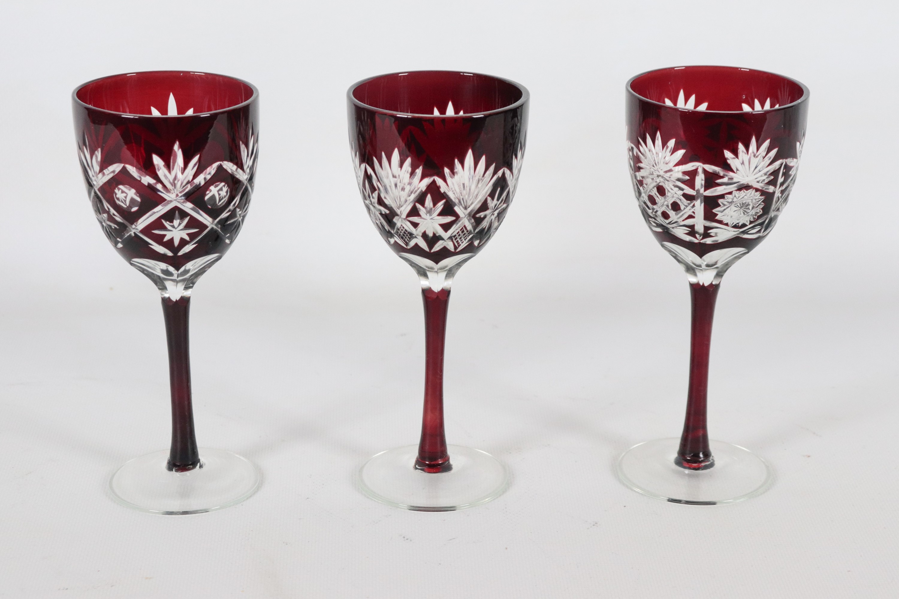 Lotto di tre bicchieri a calice in cristallo di Boemia sangue di bue, inciso a punta di diamante a motivi floreali