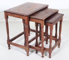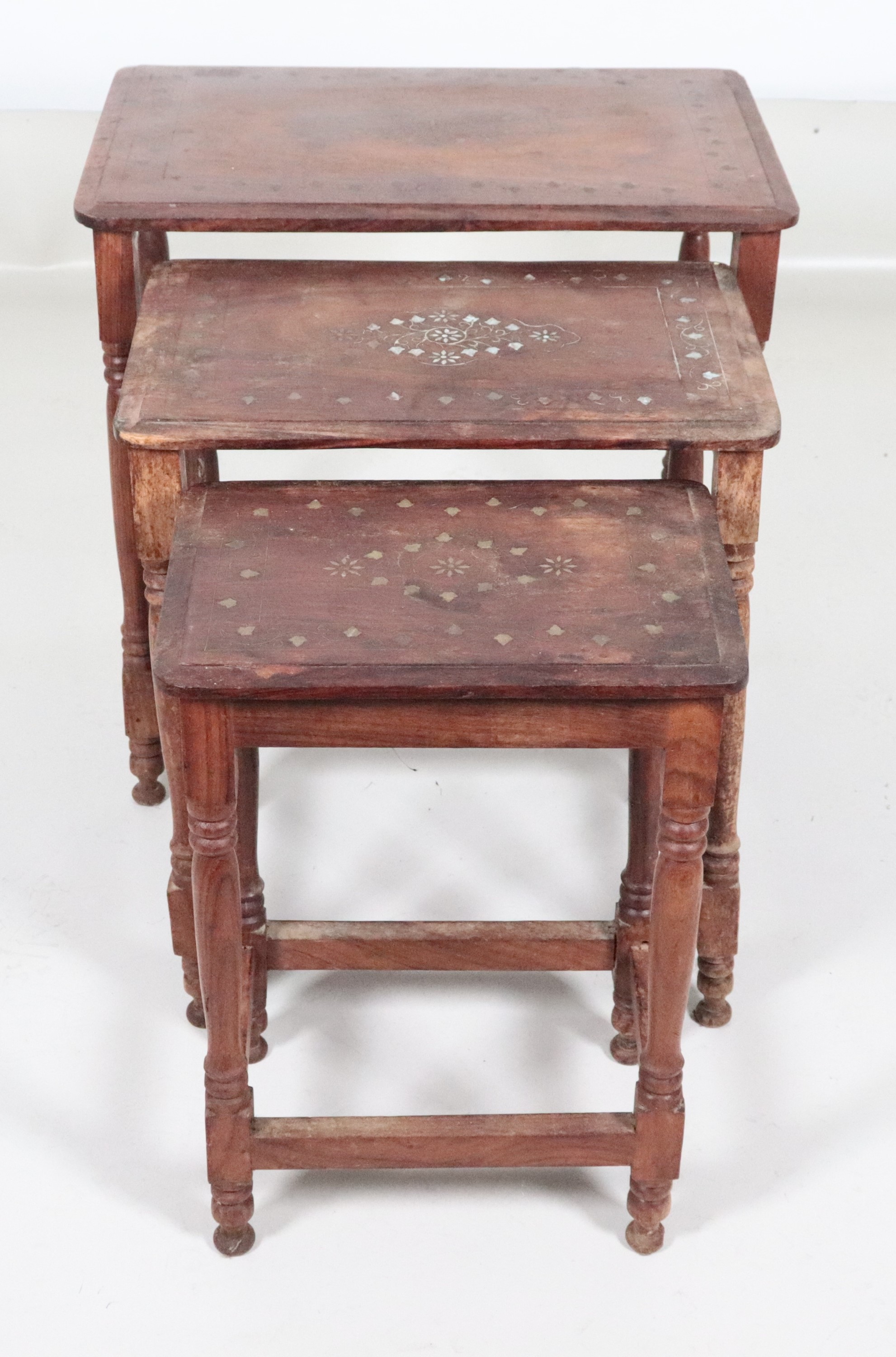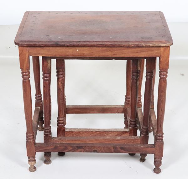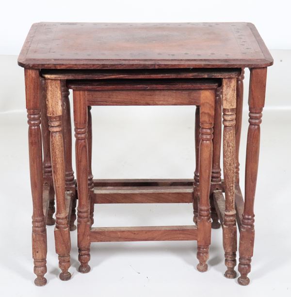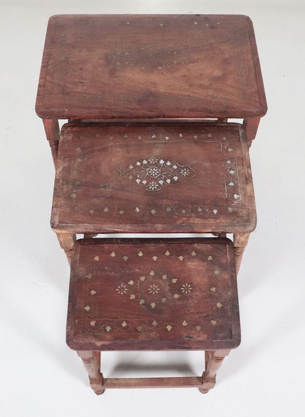 Nido di tre tavolinetti orientali in noce, con intarsi a motivi di volute e stelle