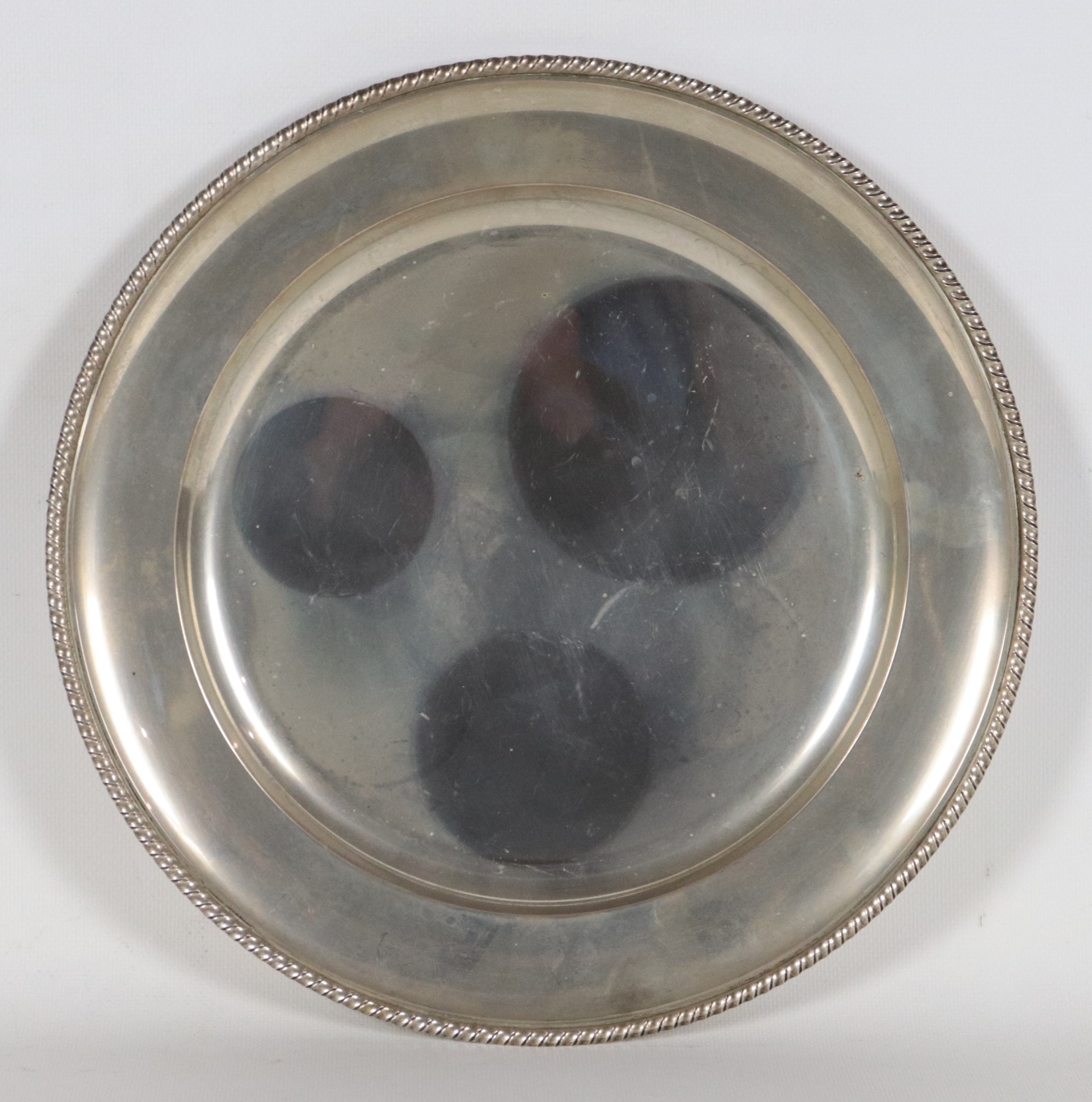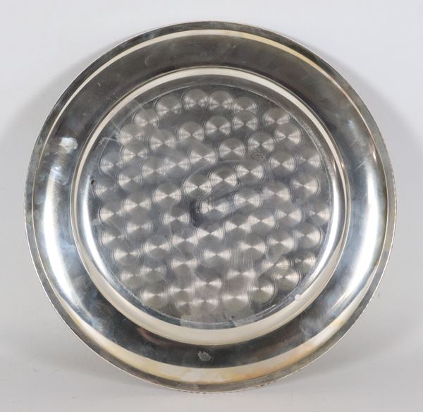 Piatto tondo in argento con bordo cesellato e sbalzato a motivi Impero, gr. 510