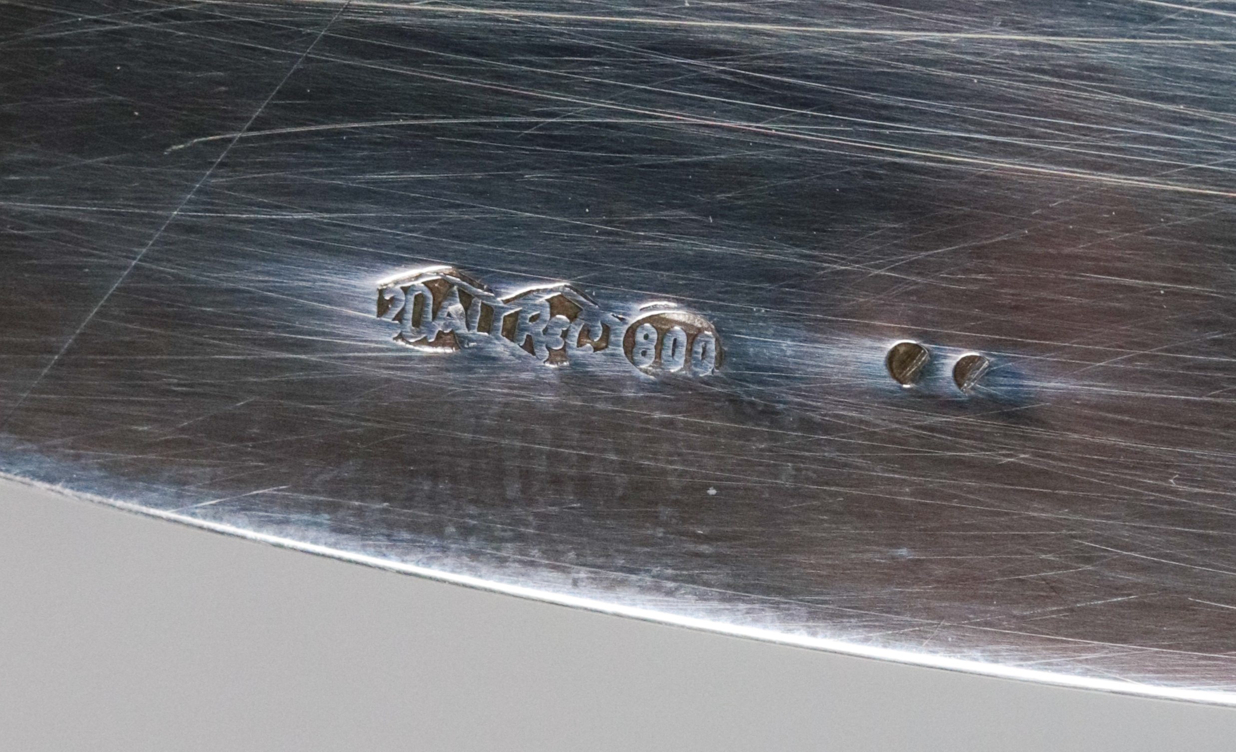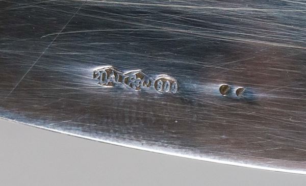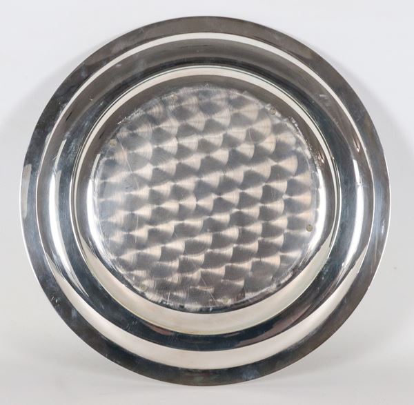 Piatto tondo in argento con bordo sbalzato, gr. 770