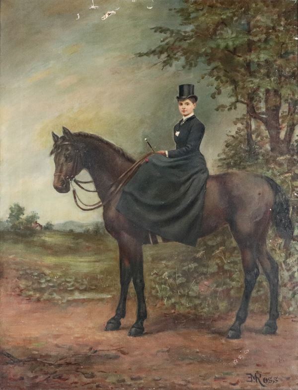 Firmato. "Ritratto di giovane nobildonna a cavallo"