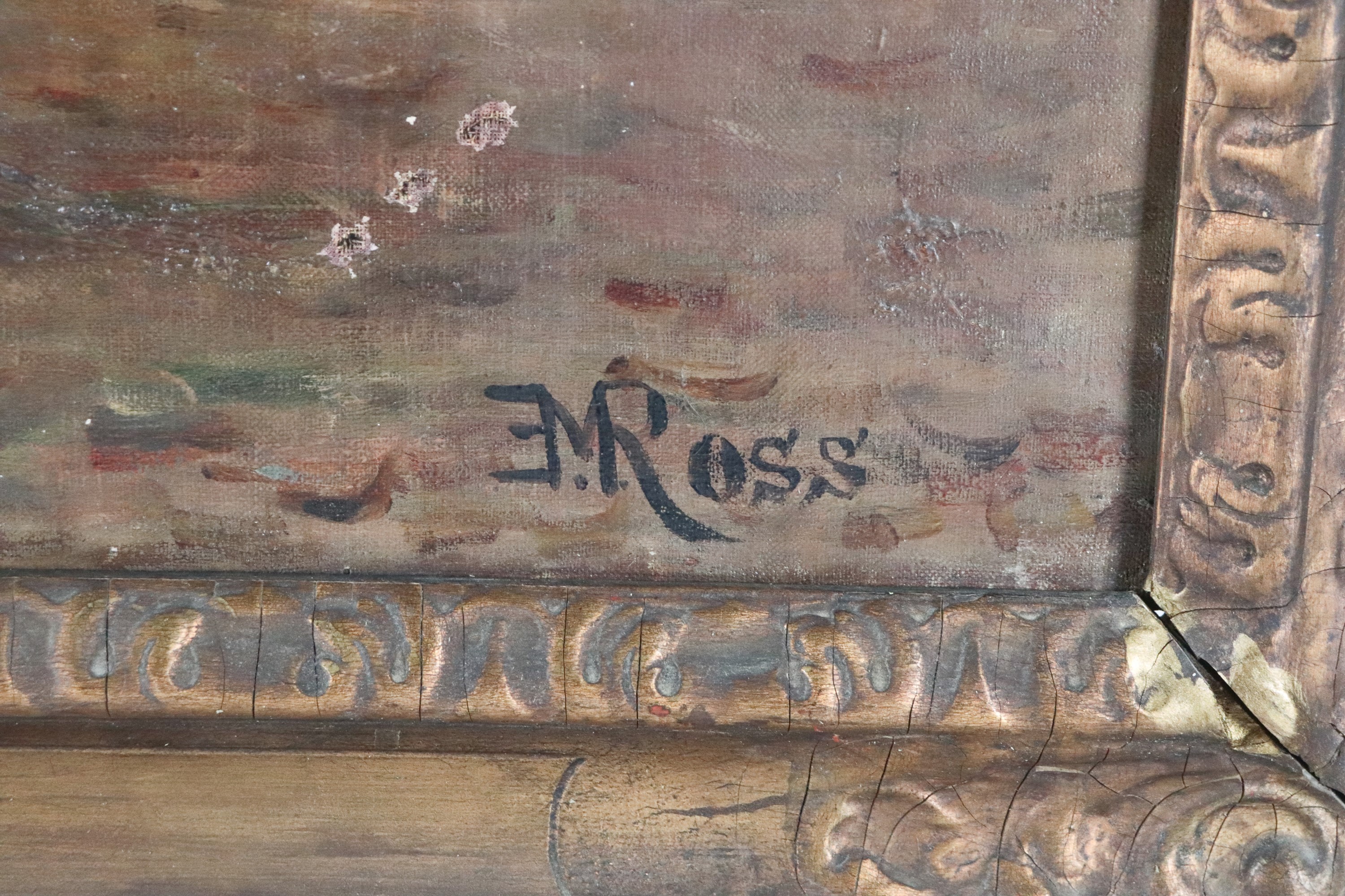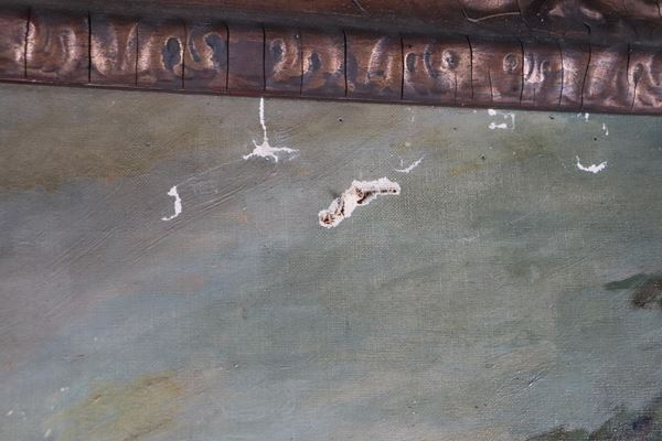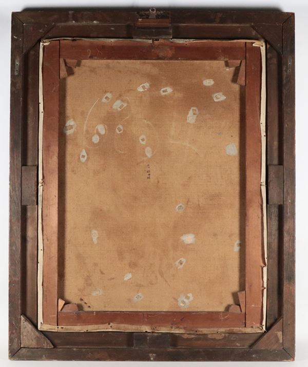 La tela presenta  qualche difetto. Cornice in legno dorato e intagliato, cm 93 x 72.