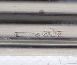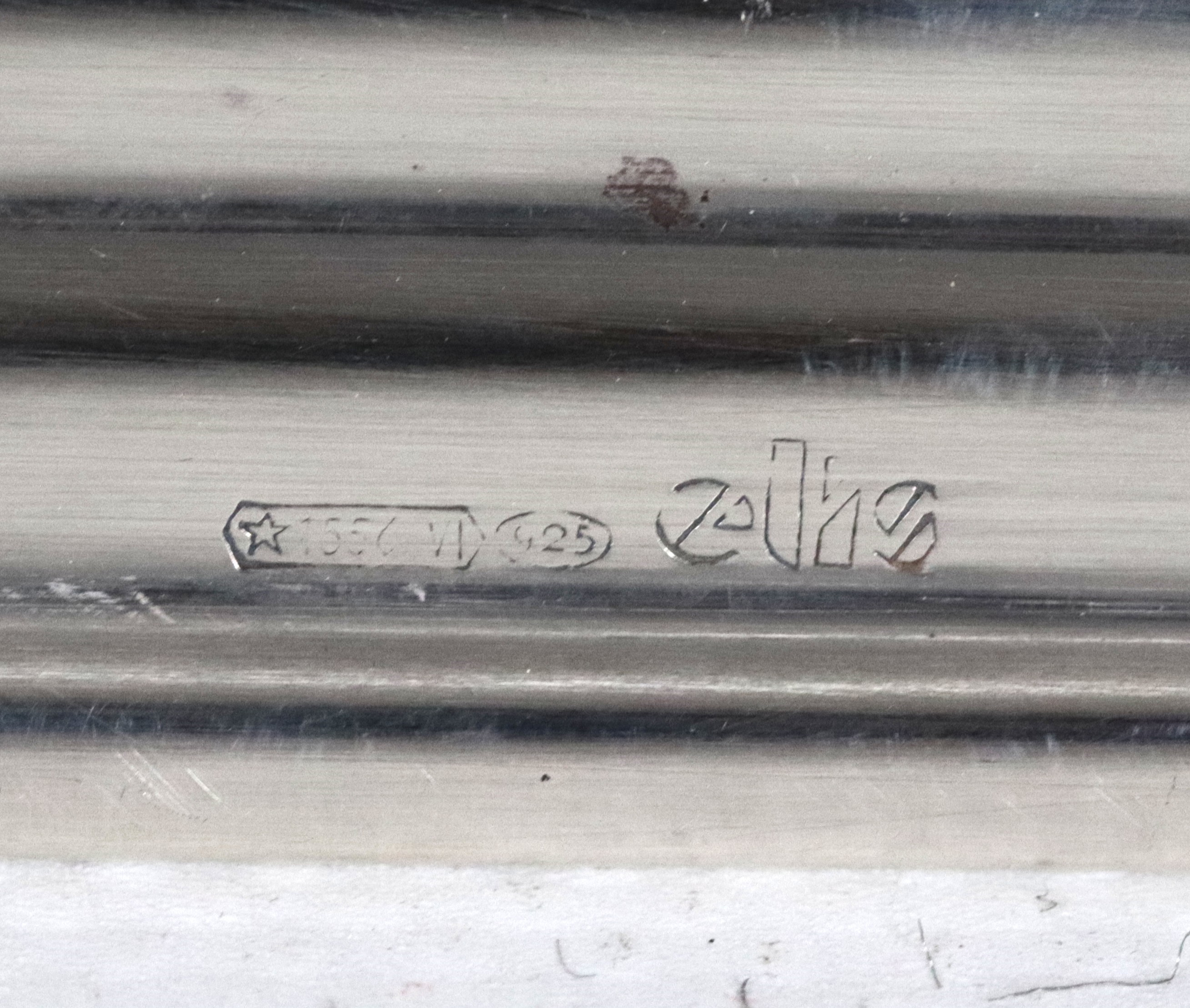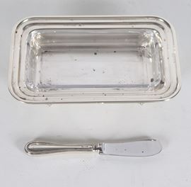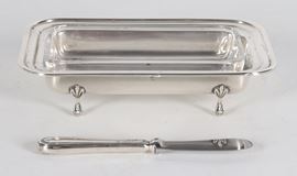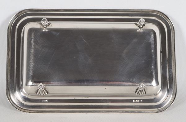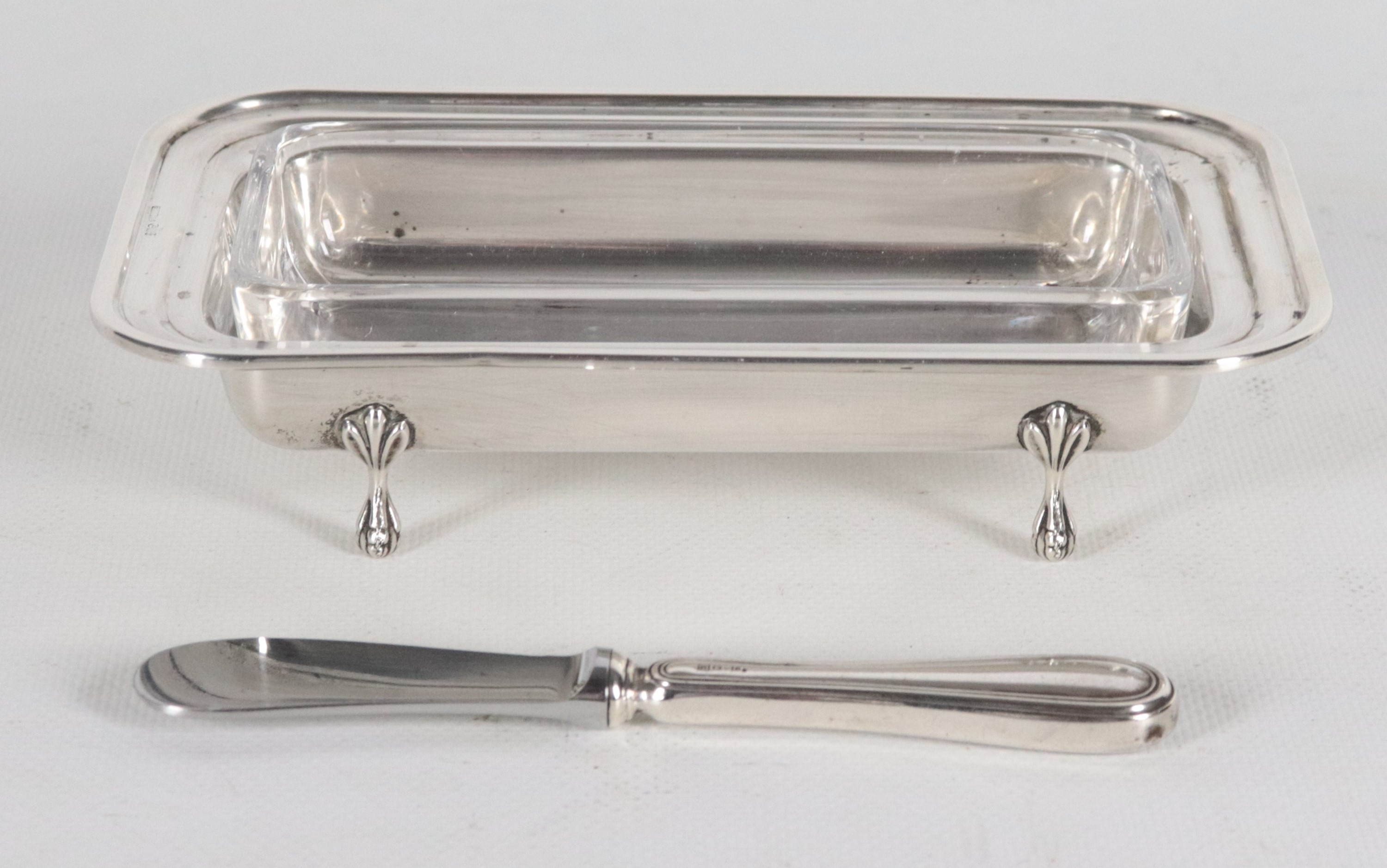 Portaburro rettangolare in argento titolo 925, con quattro piedini ricurvi e vaschetta in cristallo all'interno, gr. 180