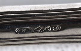 annesso coltellino con manico rivestito in argento titolo 800, cm 18 x 11 x 4 h.