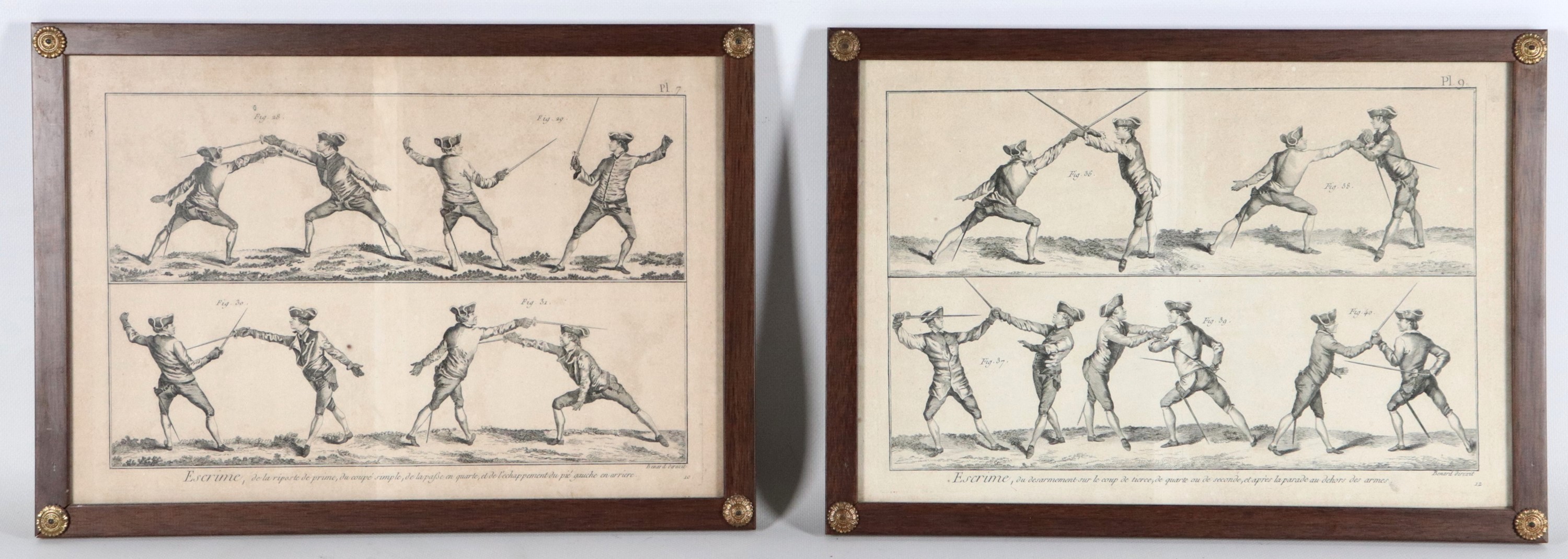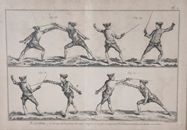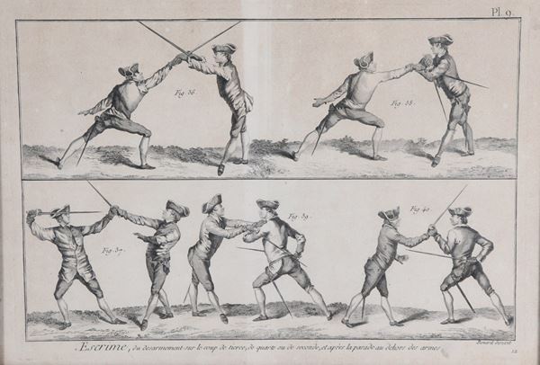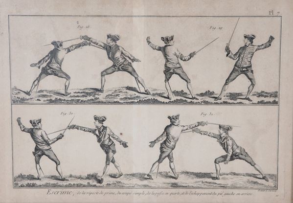 "Posizioni e azioni di scherma", coppia di antiche acqueforti francesi su carta