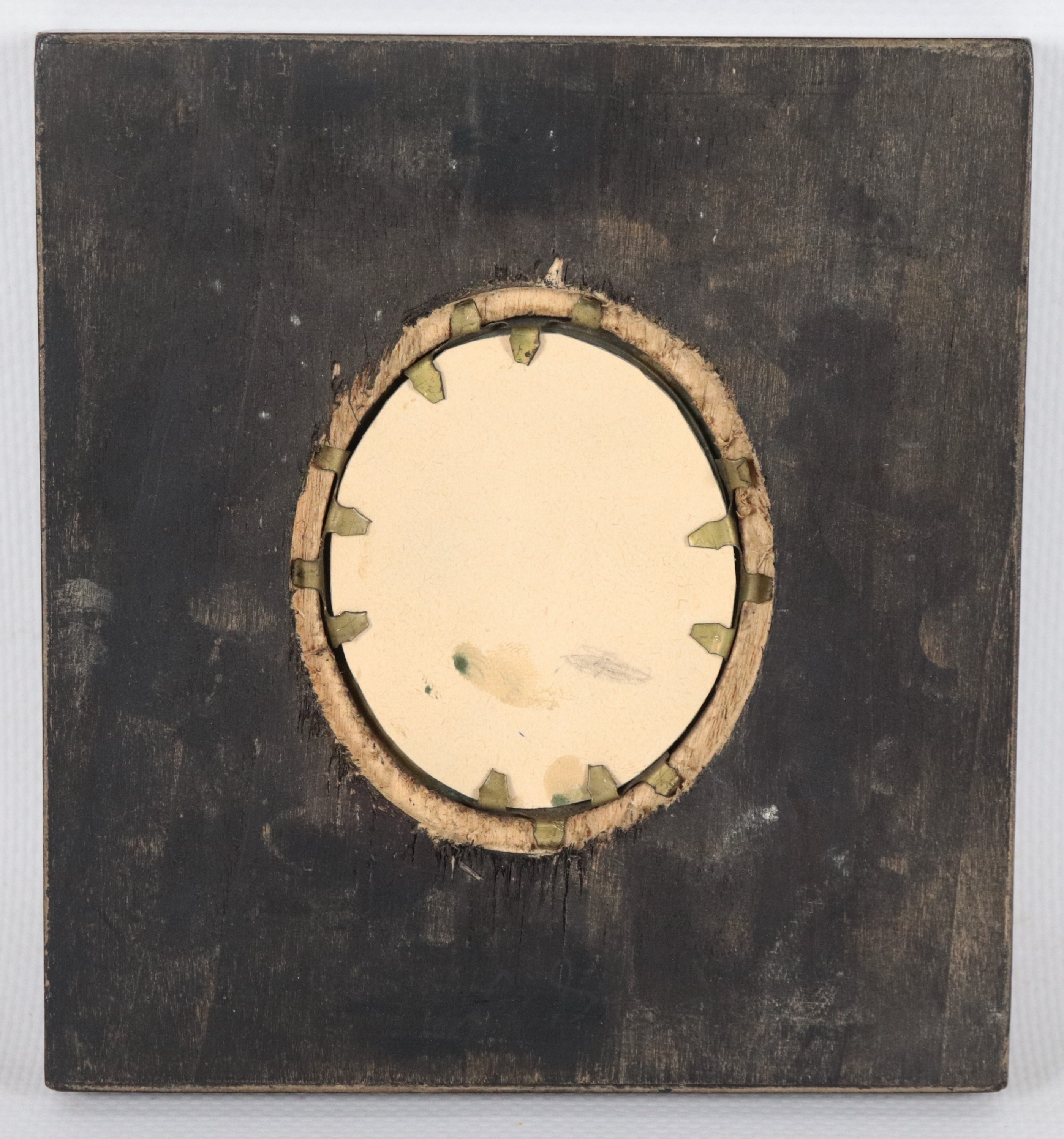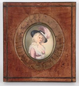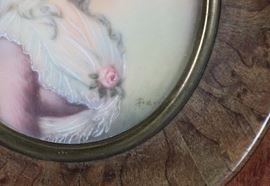 "Ritratto di giovane dama con rosa", miniatura ovale dipinta in cornice in noce