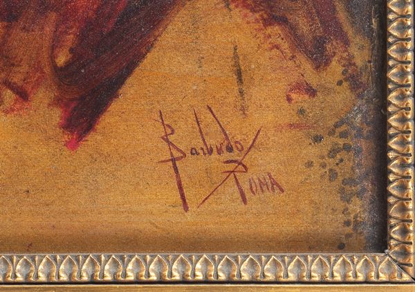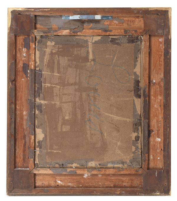 dipinto ad olio su cartoneantica cornice in legno dorato e riccamente intagliato, cm 50 x 40.