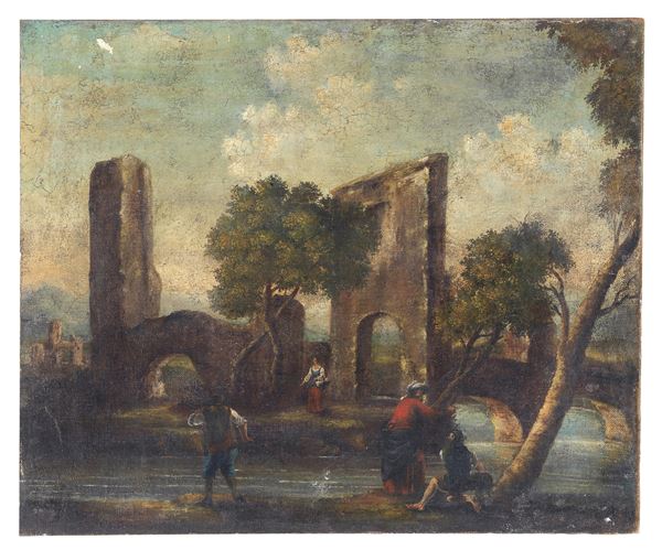 "Paesaggio con ruderi, viandanti e ponte con corso d'acqua"
