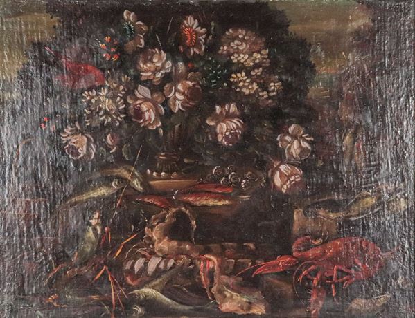 "Natura morta di fiori, pesci e crostacei"