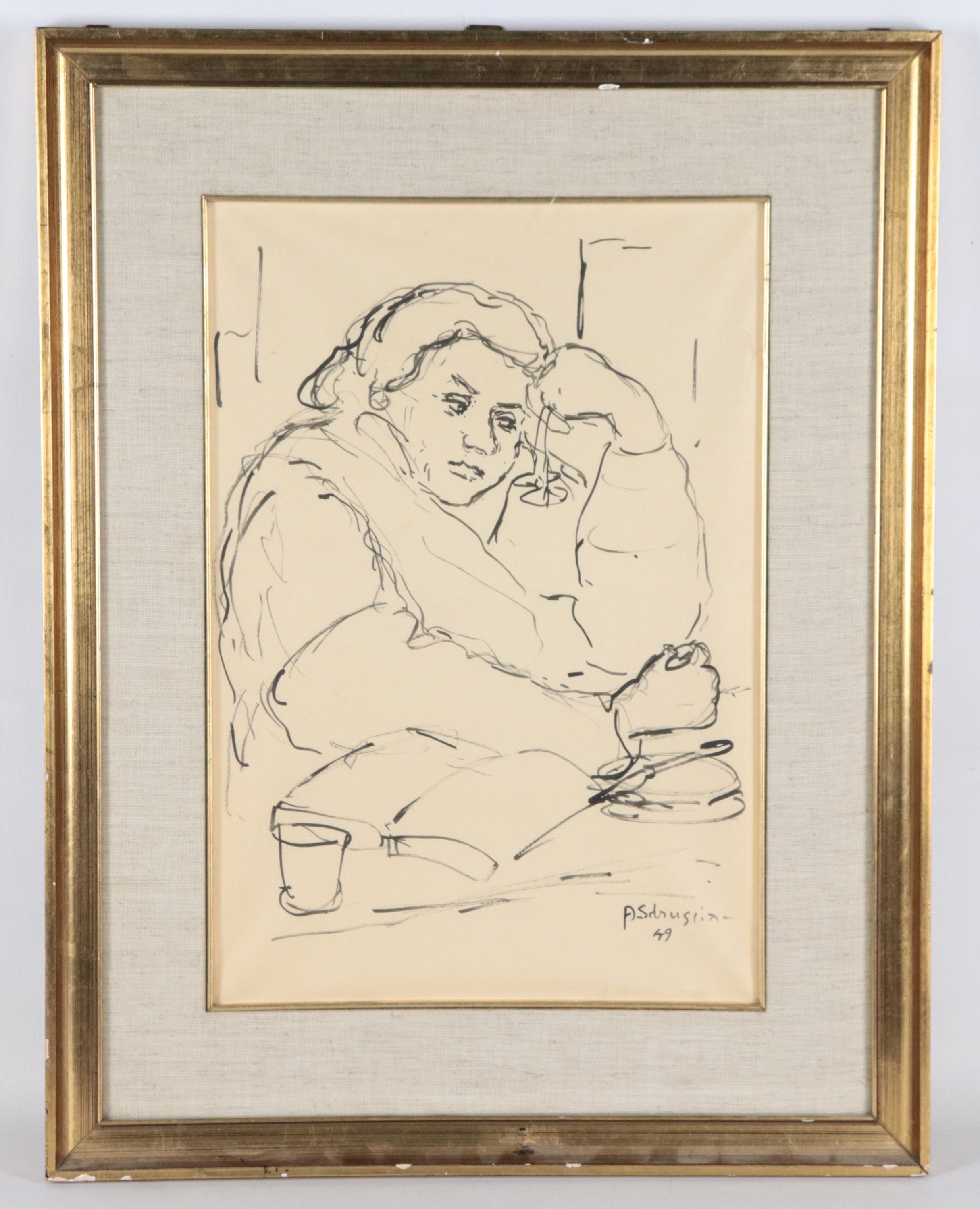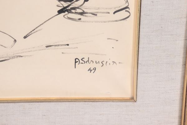disegno a china e matita su cartacornice in legno dorato e passepartout, cm 42 x 29.