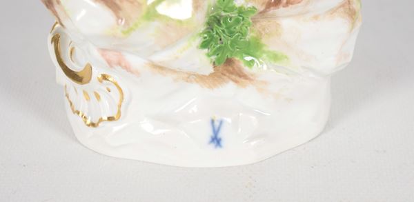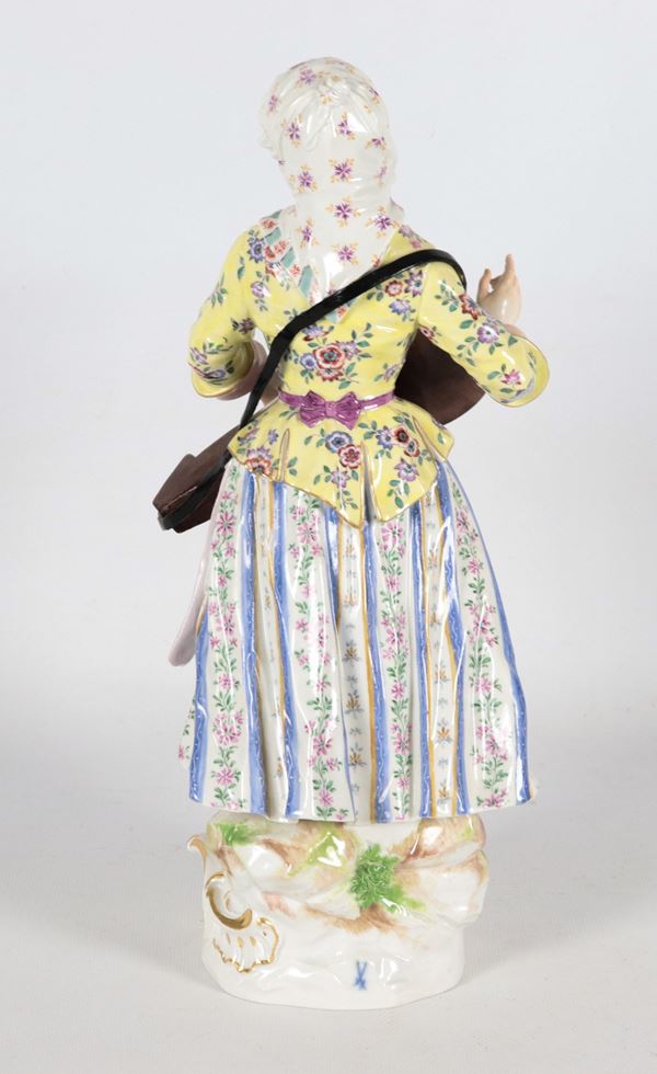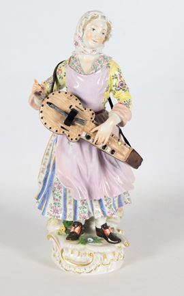 "Suonatrice di ghironda", antica scultura in porcellana policroma Meissen