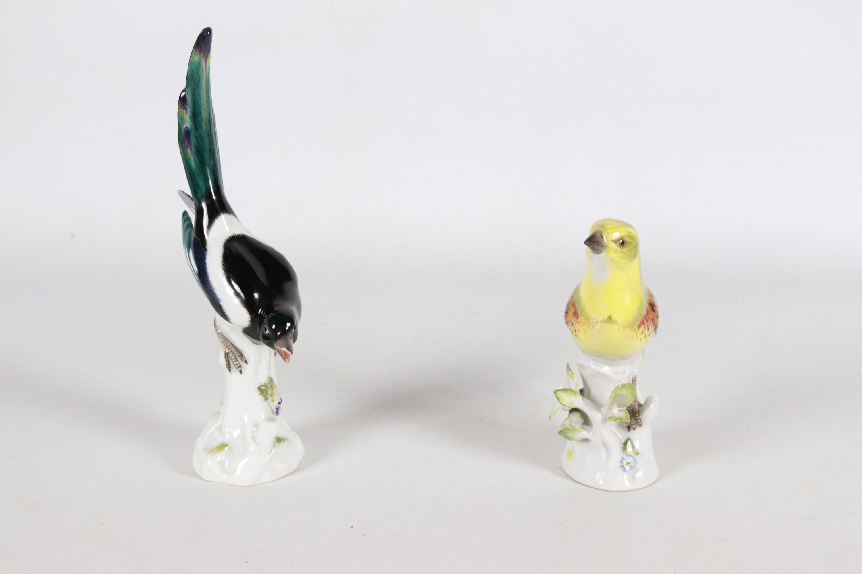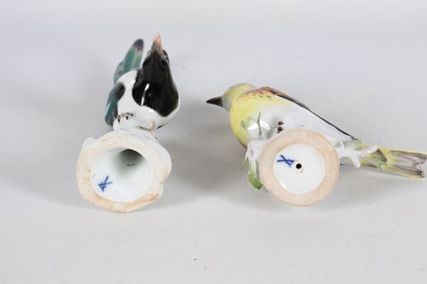 "Uccellini su rami", coppia di antiche statuine in porcellana policroma Meissen