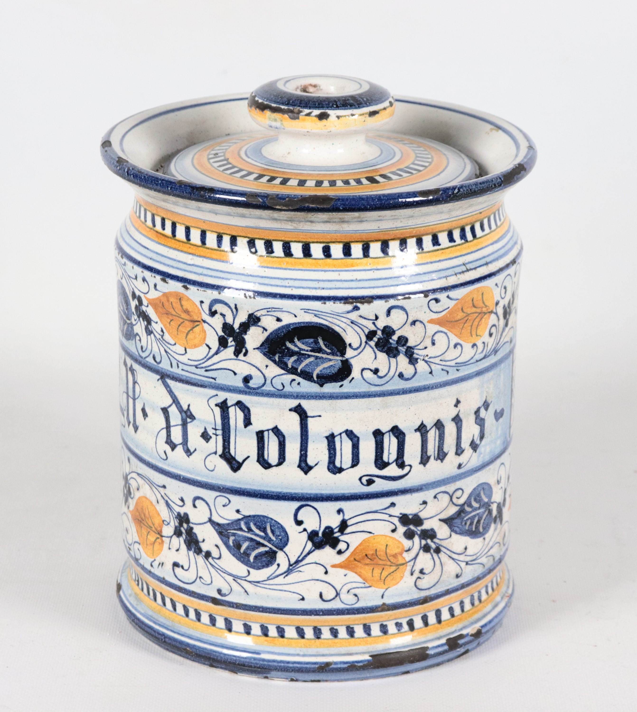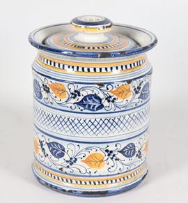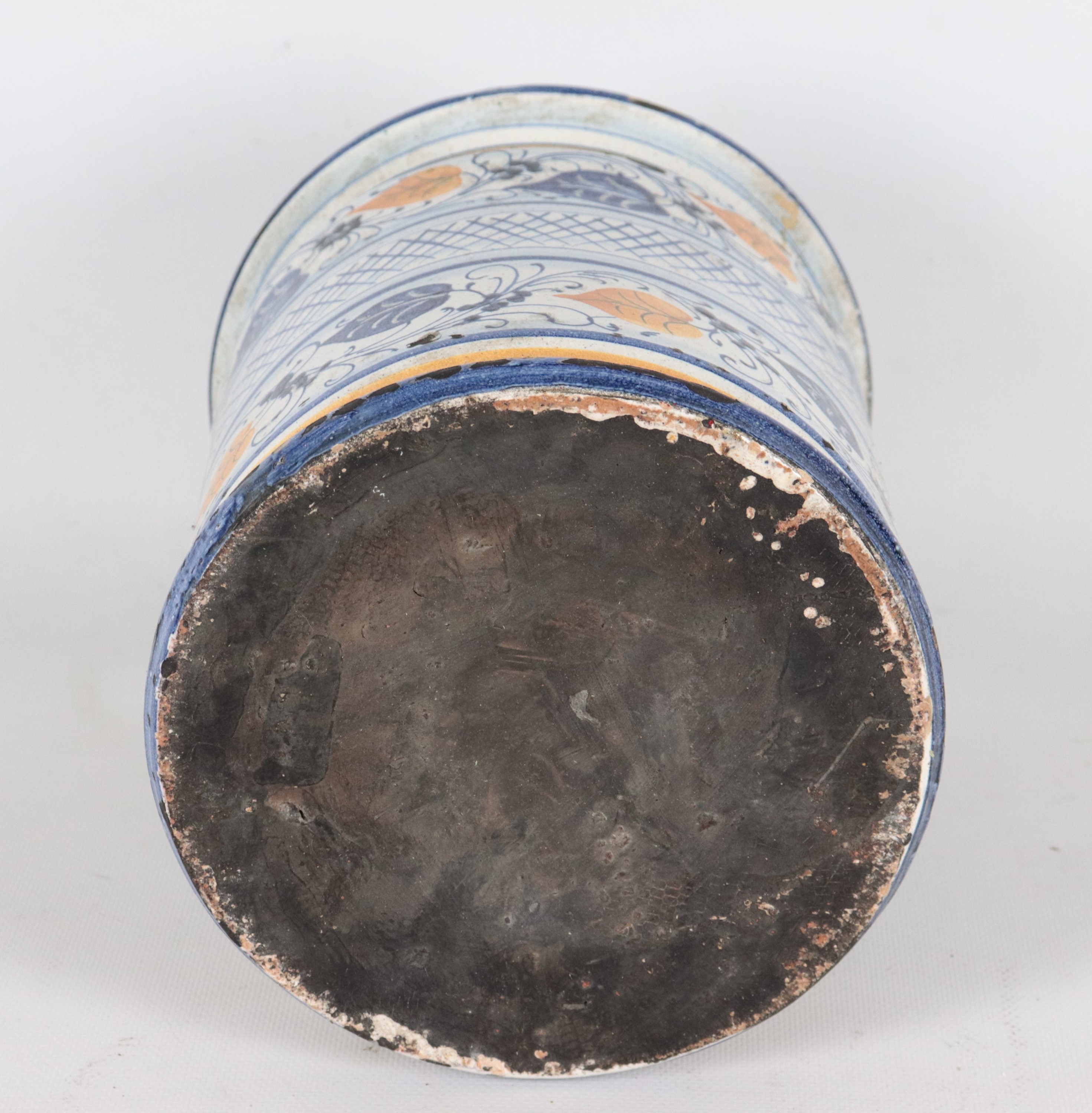 Vaso da farmacia in maiolica smaltata Deruta, con decorazioni in blu e giallo di intrecci floreali