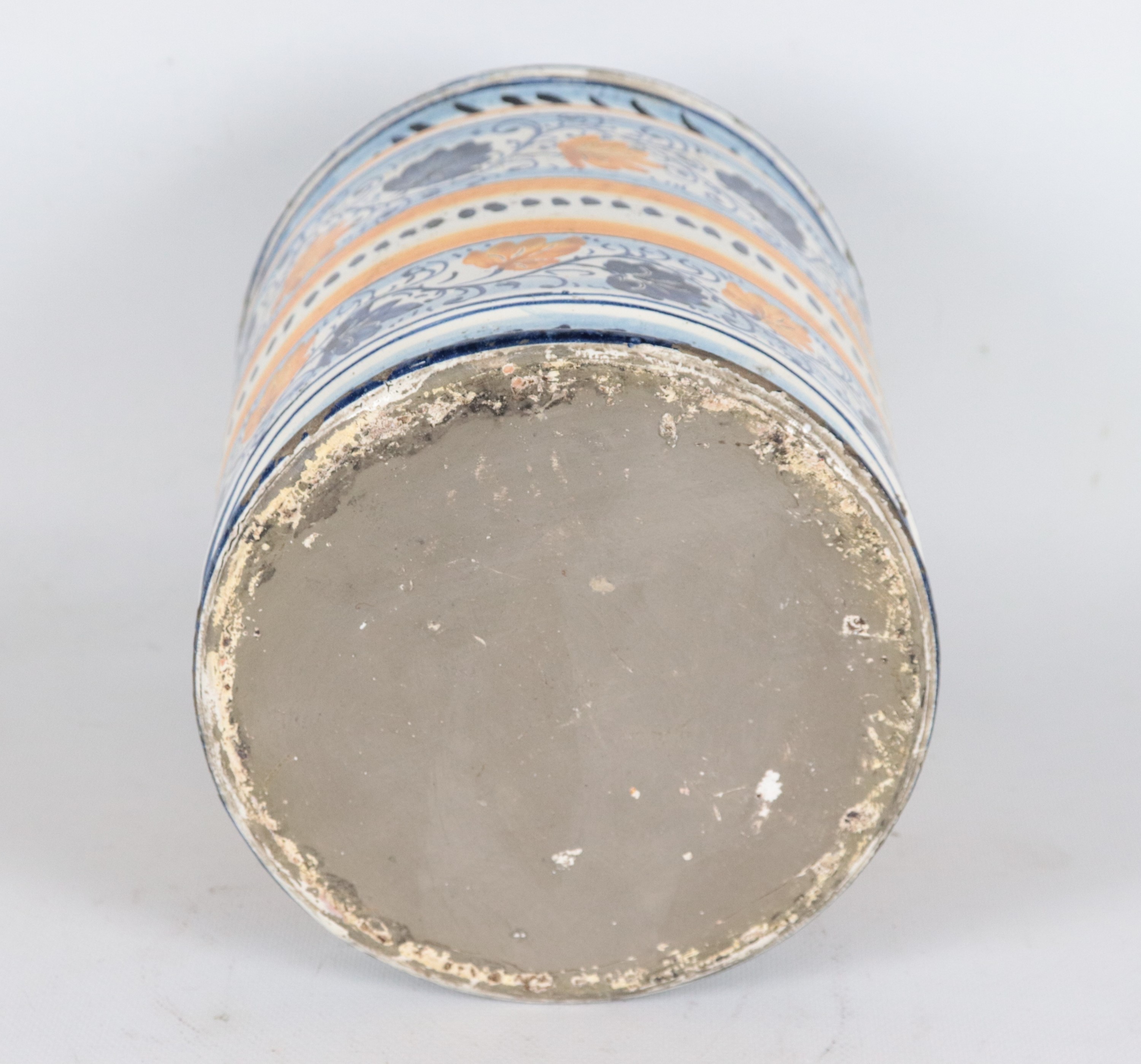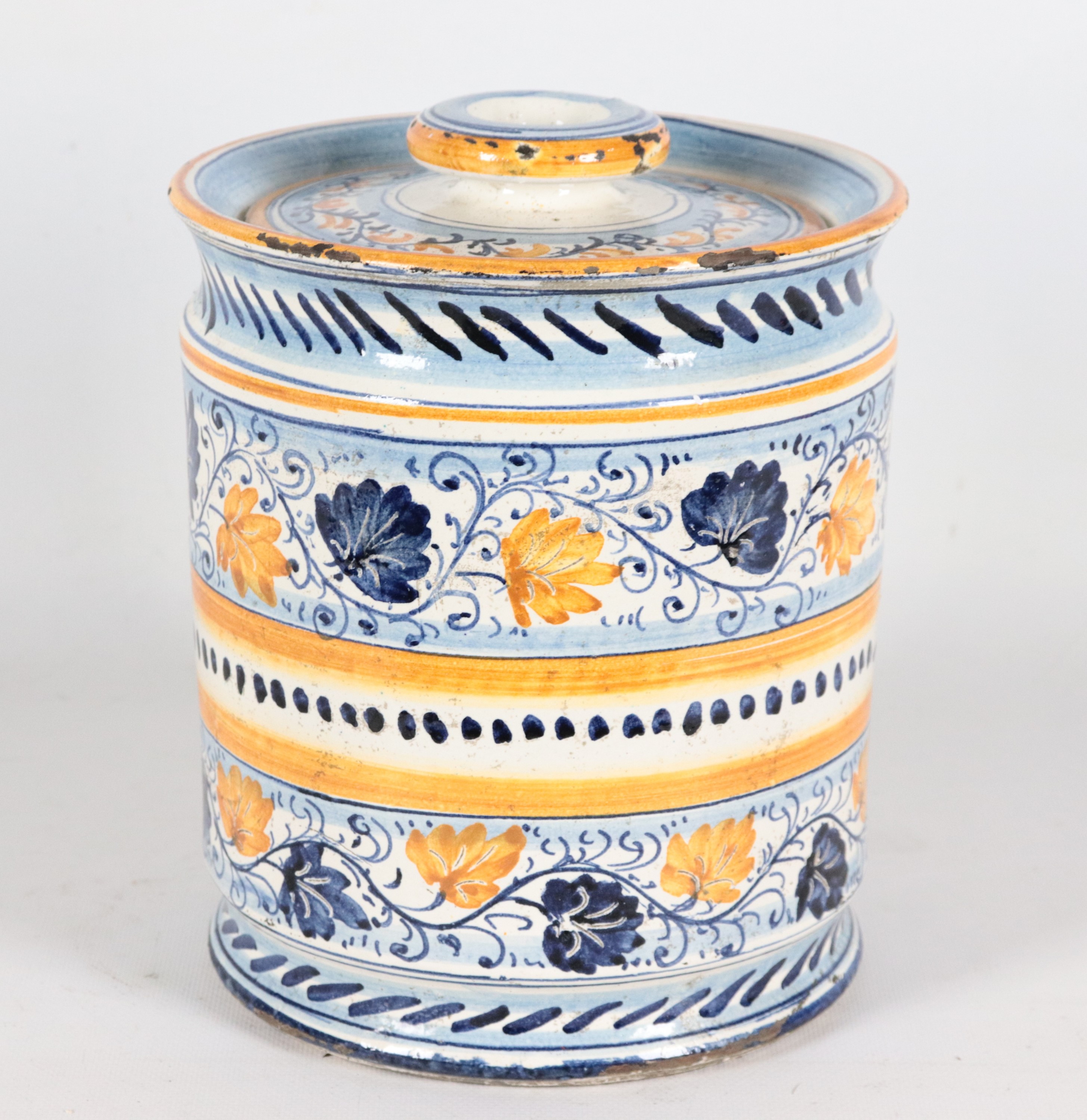 Vaso da farmacia in maiolica smaltata Deruta, con decorazioni in blu e giallo di intrecci floreali
