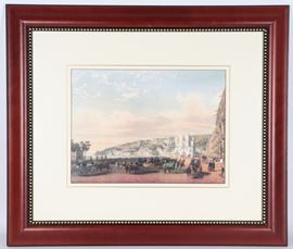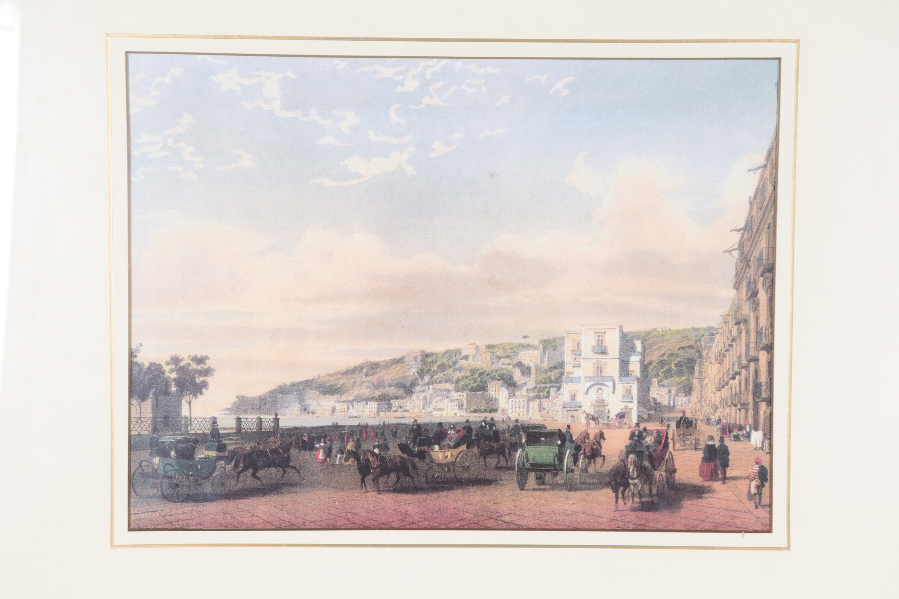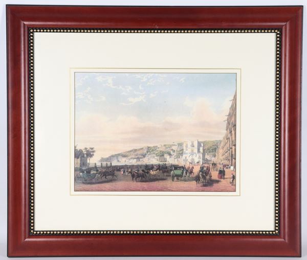"Veduta di Napoli con il lungomare e carrozze"