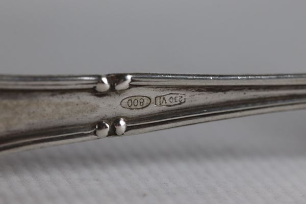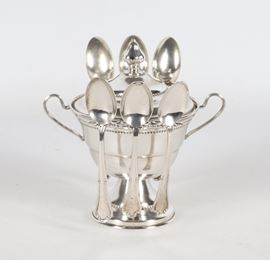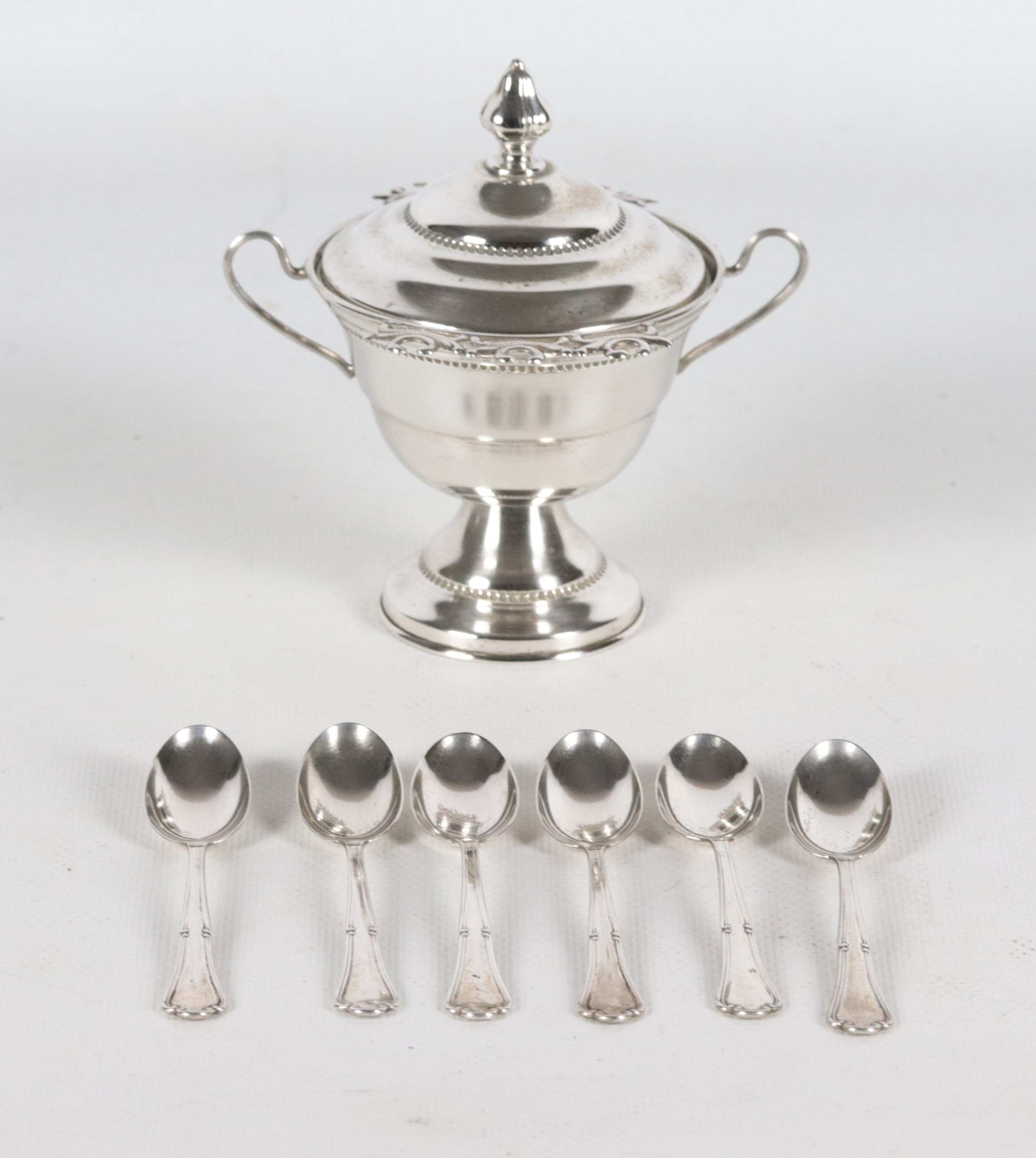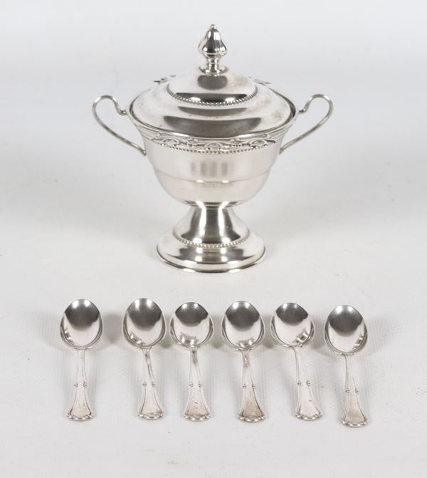 Zuccheriera in argento cesellato e sbalzato con sei cucchiaini, gr. 112