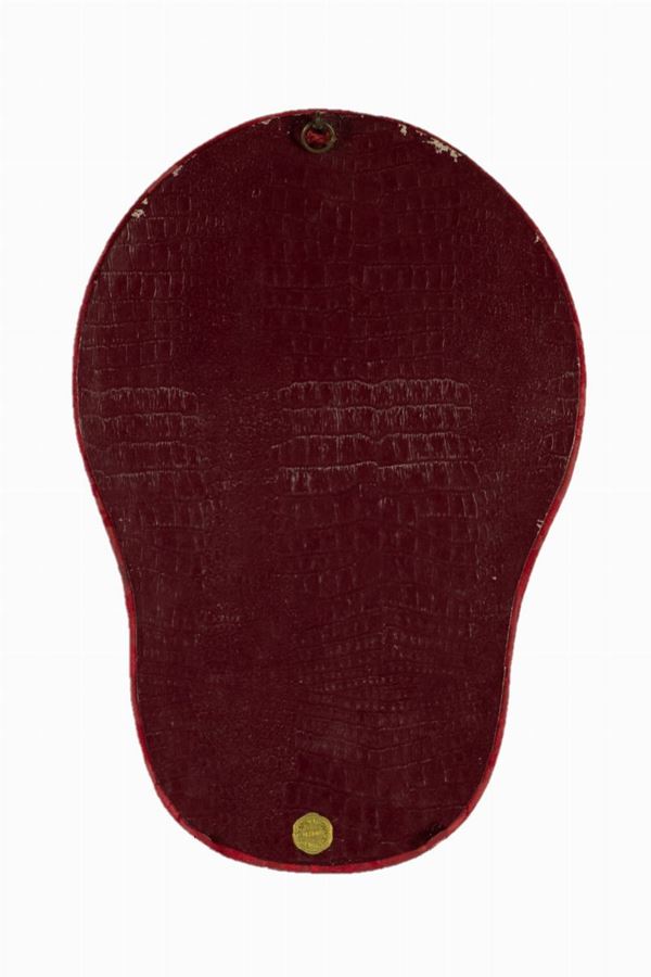 with bas-relief "Madonna with Child", support in red satin. Holy water font size cm. 15 x 30 h., With support cm. 22 x 34 h.