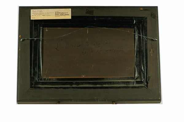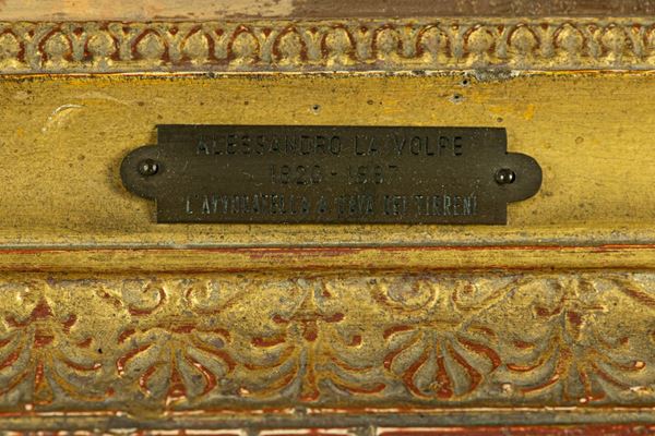 oil painting on a tablet by the Pugliese artist who, at a young age, moved to Naples with the intention of developing his artistic propensity. He attended the Institute of Fine Arts in Naples and in particular the landscape painting course of Gabriele Smargiassi of which he became a student. Exponent of the second generation of the Posillipo School, together with Giacinto Gigante and Teodoro Duclère, in the mid-nineteenth century he also came into contact with the painters of the Sienese School of Taggia. His pictorial production was directed to the Neapolitan landscapes, to the coastal subjects with fishing boats as well as to the oriental themes following his travels to Egypt, obtaining considerable success with the wealthy English tourists, in fact a good part of his pictorial production ended up in Great Britain. Frame in gilded and carved wood. Measure cm. 22 x 38.