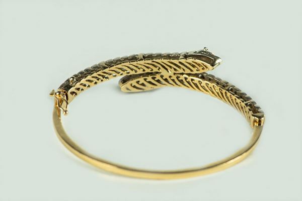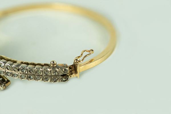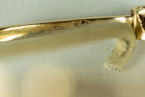 in 14 Kt gold. with diamond rosettes and two small rubies. Measure cm. 6 x 5. & nbsp;