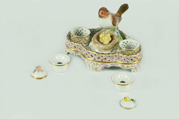 with two ink bottles and a bird figure in the center. Defects in the bird's beak and the two lids. Measure cm. 14.5 x 13 x 11.5 h.